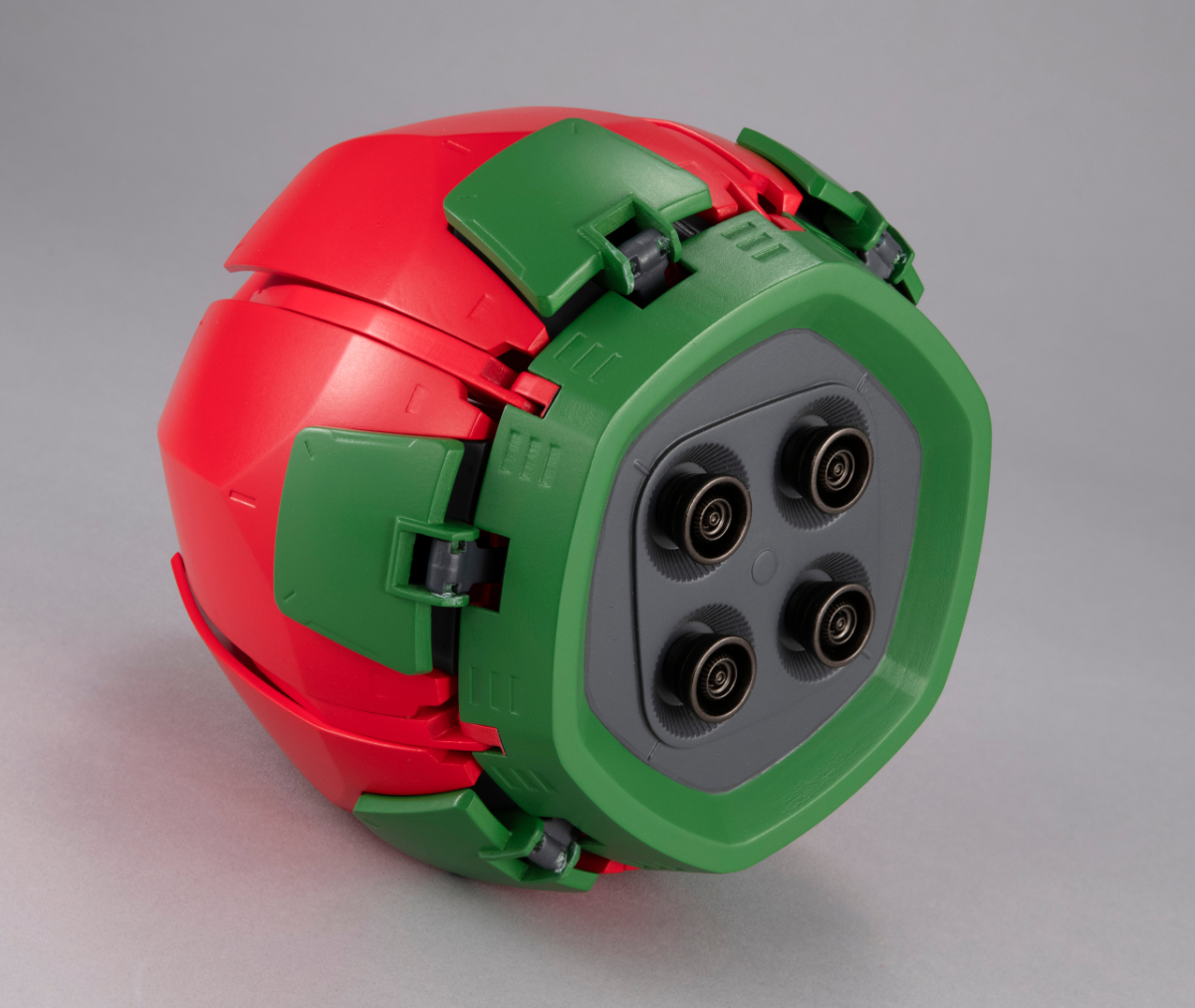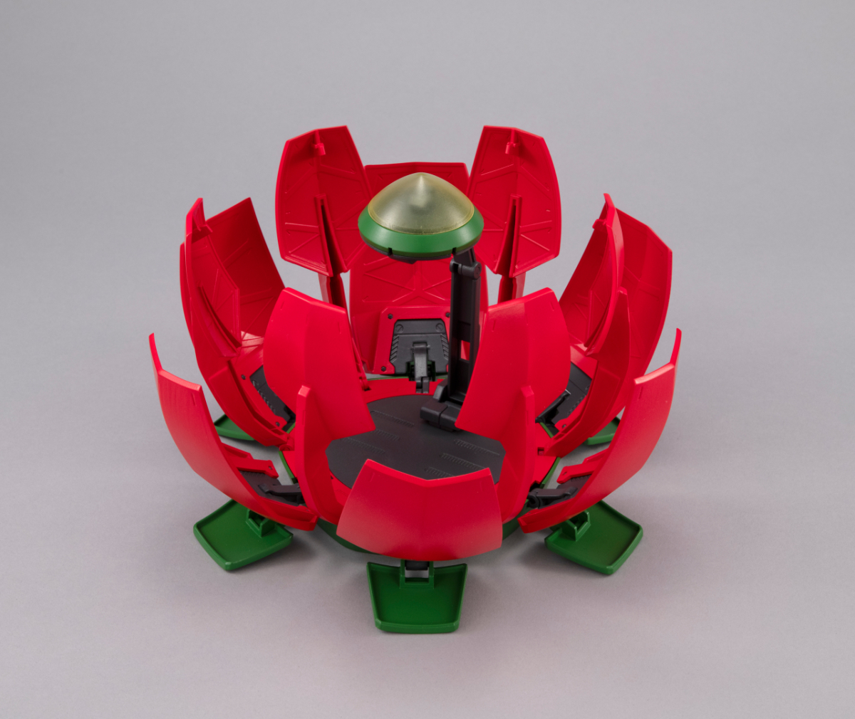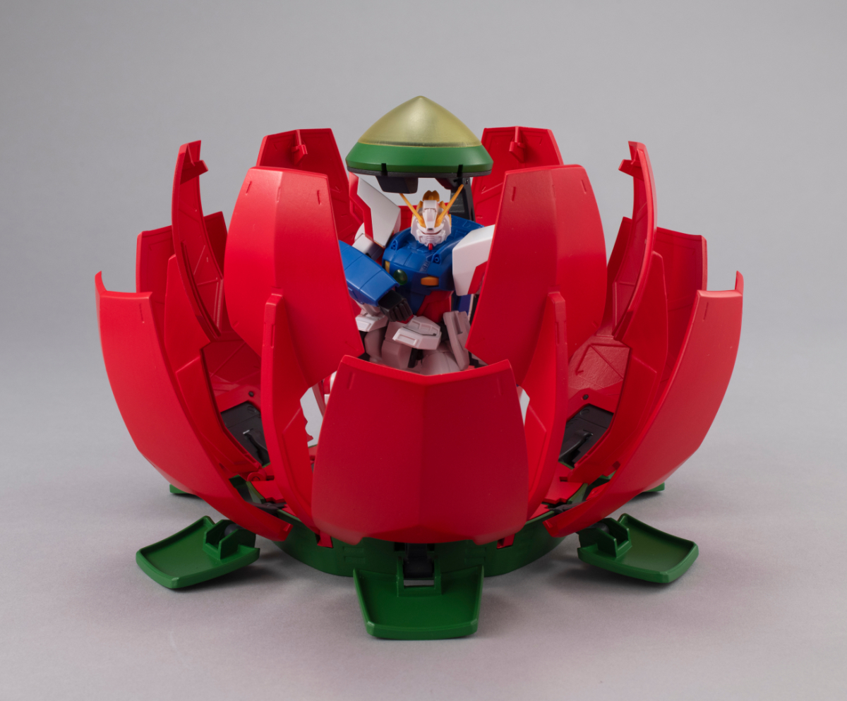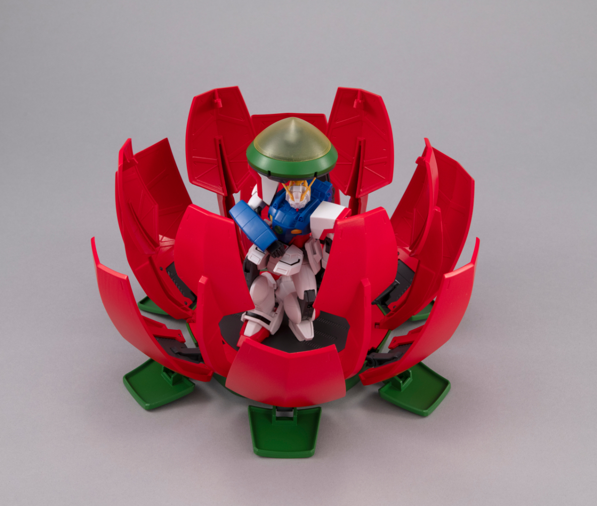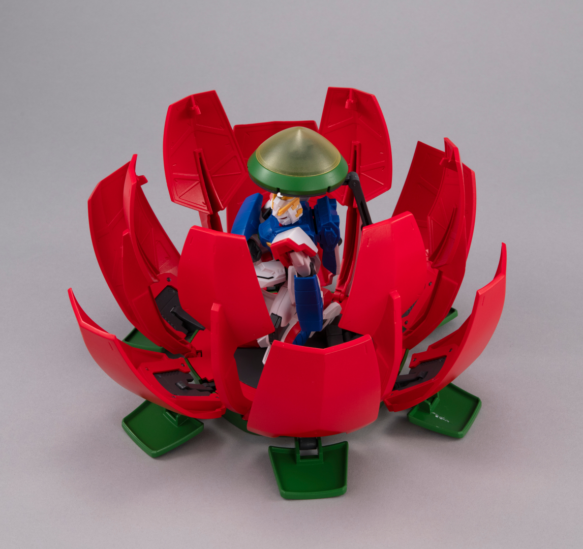 「MACHINE BUILD 花蕾運輸艙」採用接近鋼彈模型 1/144 比例的尺寸製作,內部能夠收納 HGCF 閃光鋼彈等同比例的鋼普拉。整體造型同時再現頂部艙蓋、底部推進噴嘴造型,彷彿蓮花的外裝甲製作出花萼、外層花瓣、內層花瓣的三層構造,藉由各自獨立的可動軸再現層層展開的華麗出擊場景。