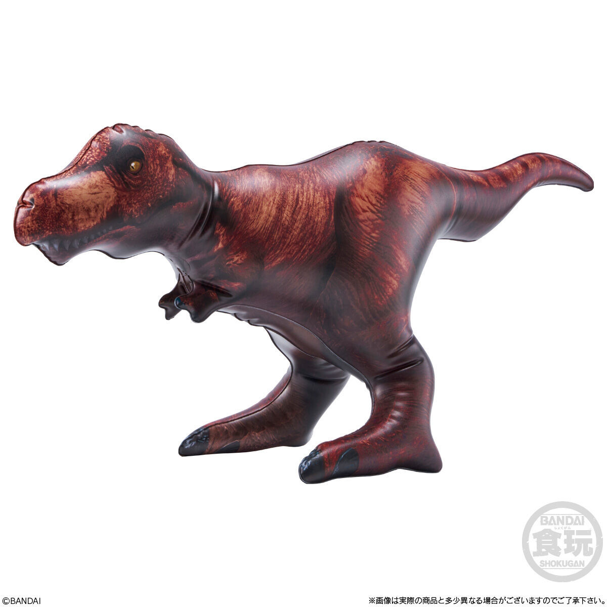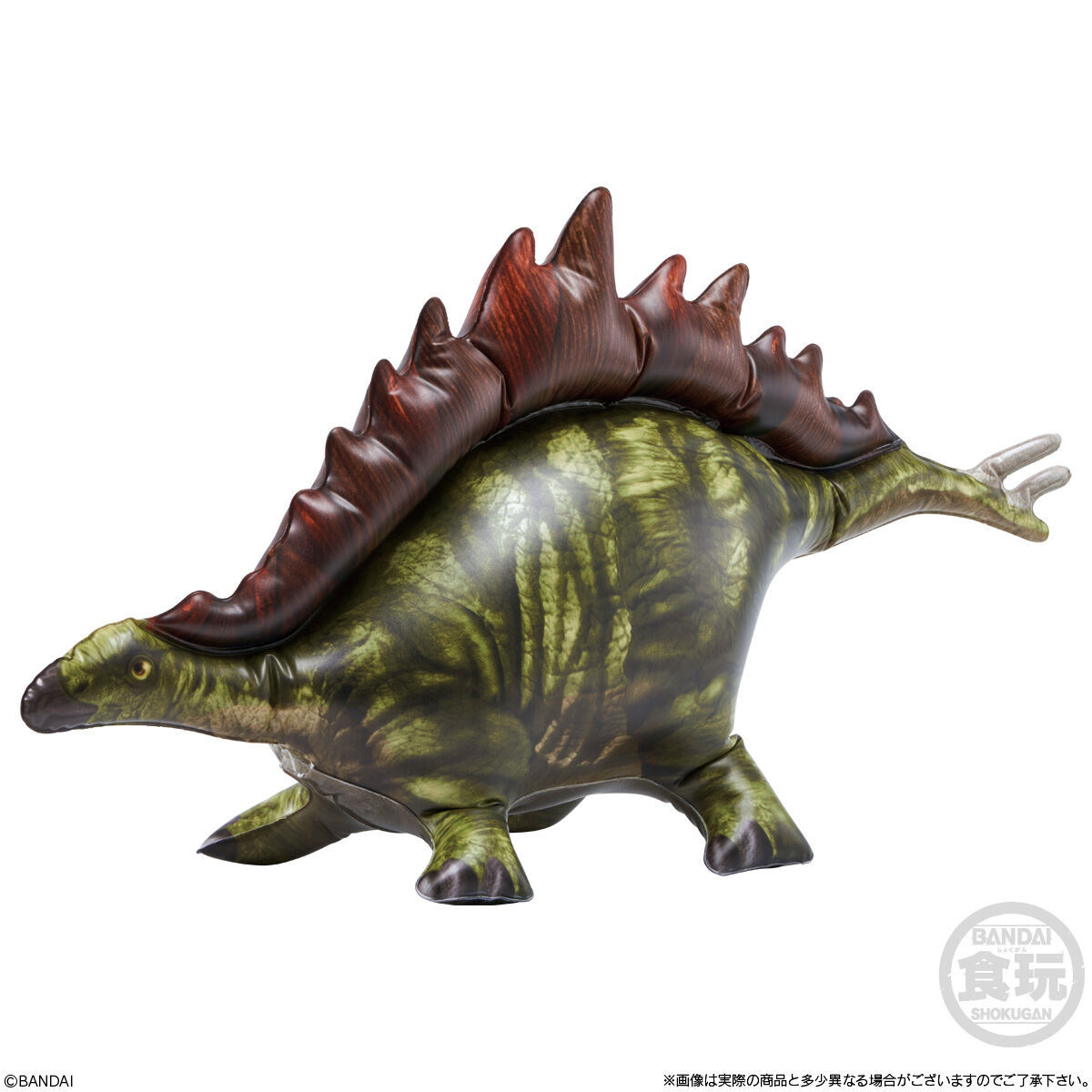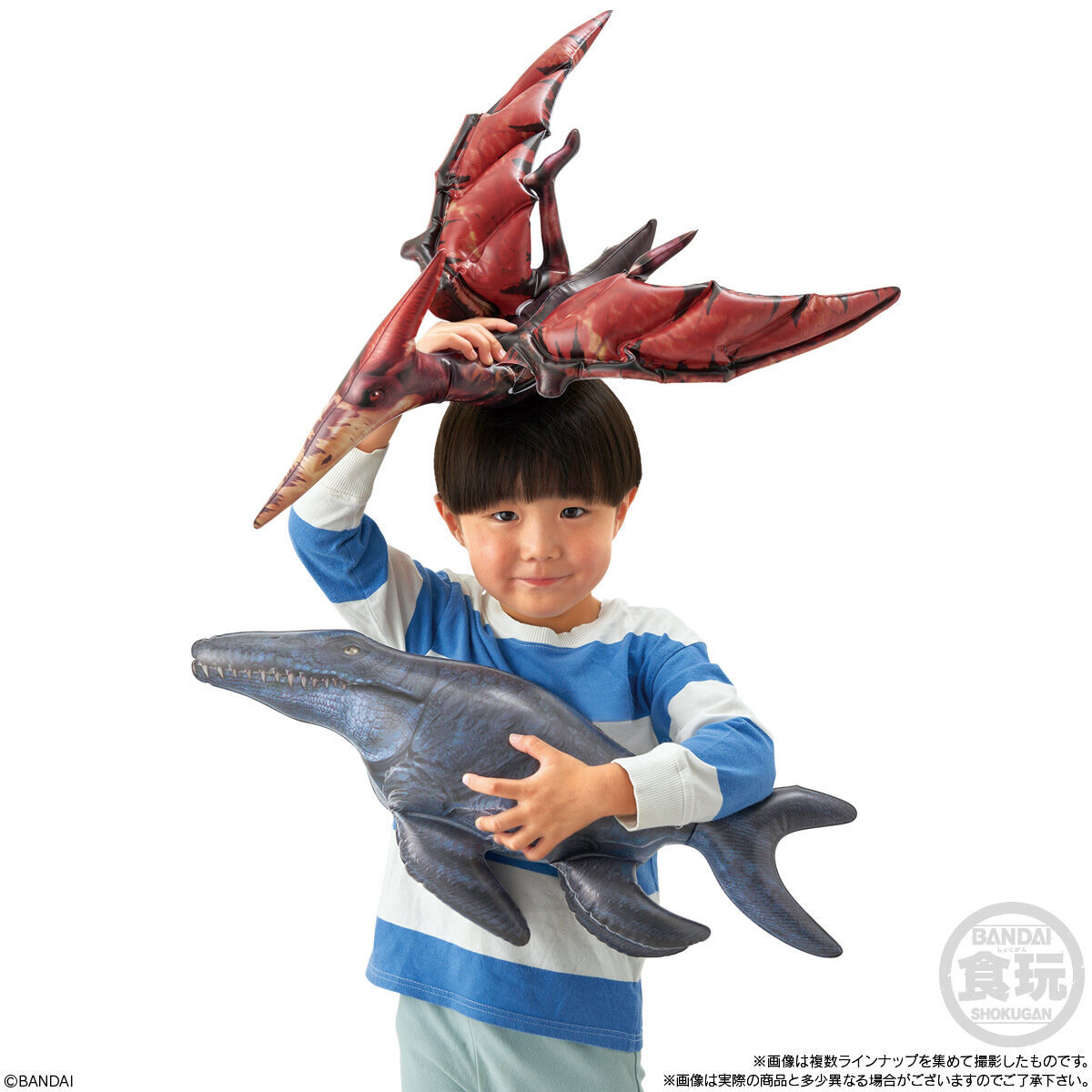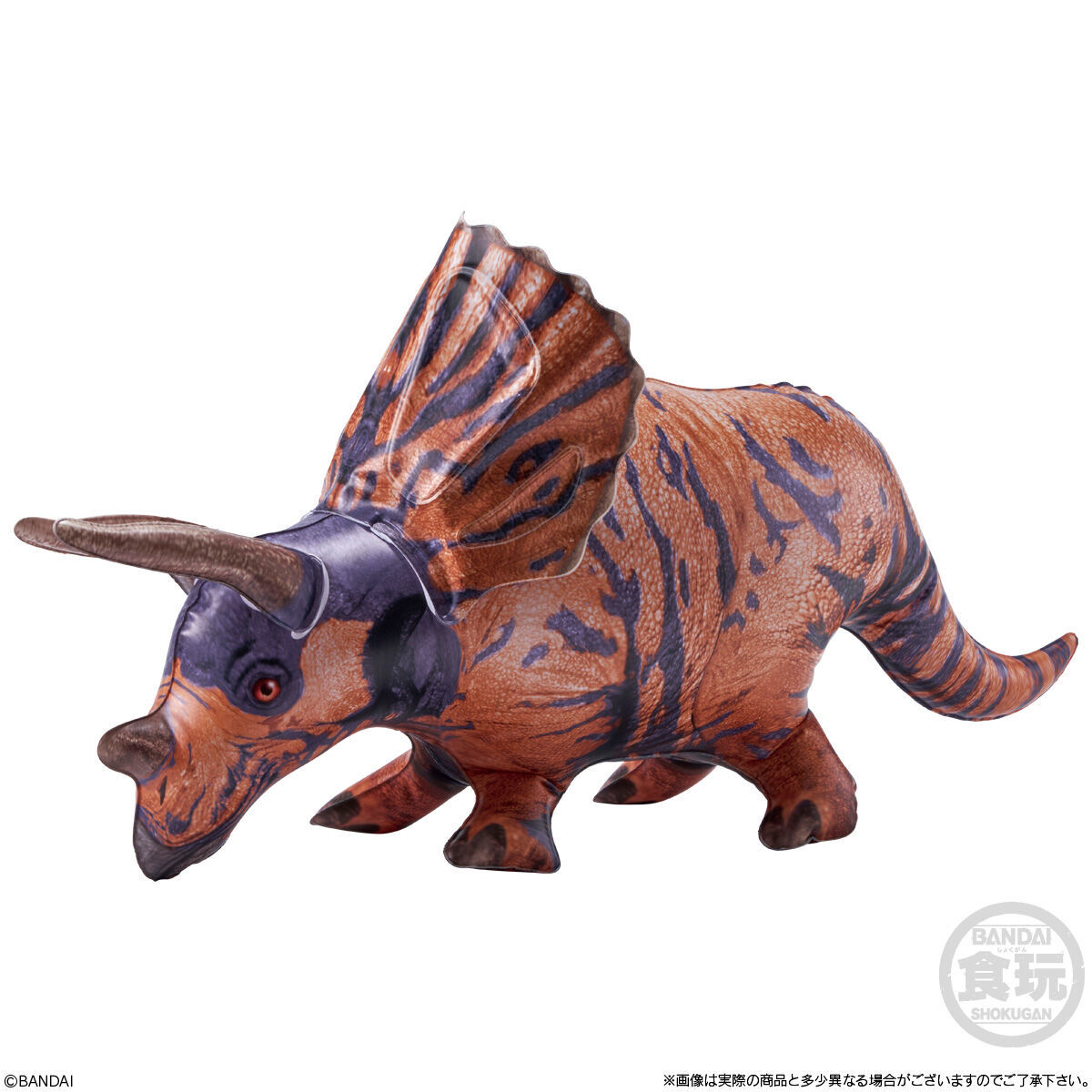 擁有大魄力視覺效果的人氣恐龍就在你的手中!只要將空氣灌進去就可以輕鬆把玩啦~這次的「生物探險隊~恐龍篇~」告別了種類繁多的昆蟲們,選擇以遠古時期稱霸地球的巨無霸生物為題,打造出霸王龍、三角龍、腕龍、無齒翼龍、滄龍、劍龍的充氣玩具,尺寸部分從 48~58 公分都有,把氣灌飽之後,就能清楚瞧見每一種恐龍體表的紋理印刷,並且能夠感受牠們極具存在感的尺寸與形體,相當可愛。