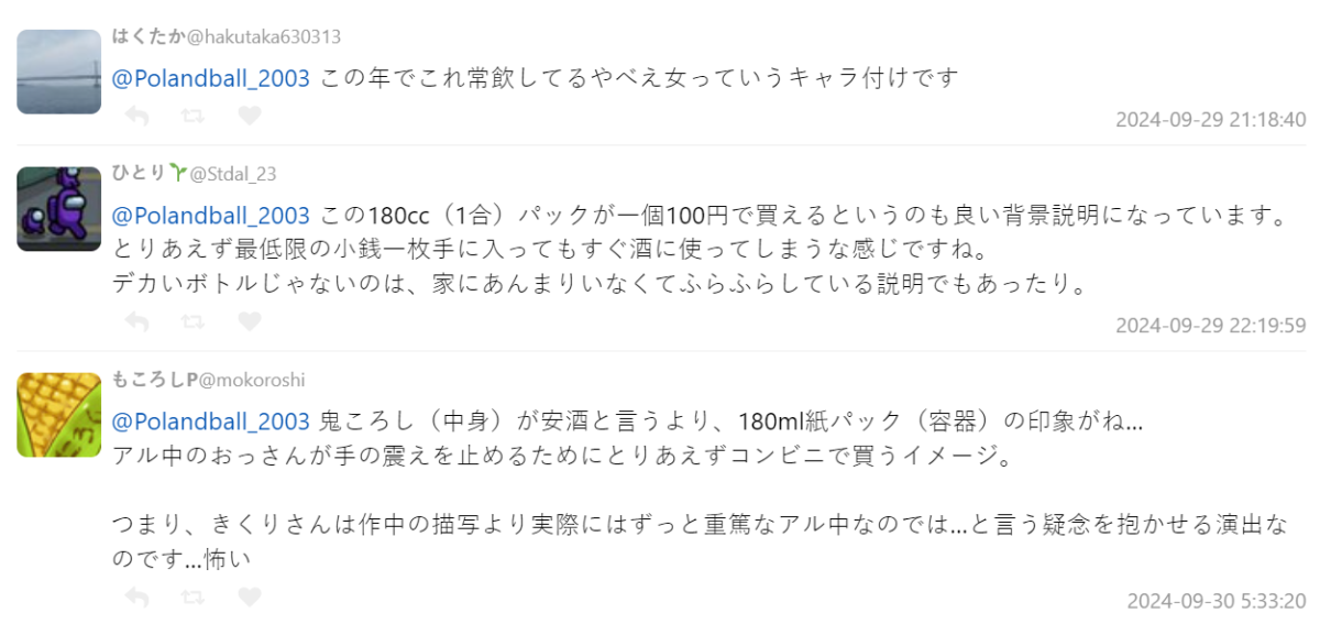 而最近日本 X 上,有網友指出「鬼殺清酒」近來已經被貼上一種底層酒鬼愛喝的標籤,尤其廣井在劇情中喝這種酒,傳達了一種「完蛋了的人」的訊息。