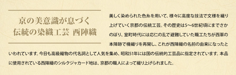 「西陣織」起源可追溯至五世紀,為當時的皇室開發的織品工藝,採用多種高度技法、並透過染色精美的彩線編織而成的優秀工法。因室町時代因為應仁之亂逃離到西軍的工匠在當地編織而命名。至今已經被列為日本國內的傳統工藝品,被視為高級織品的象徵。