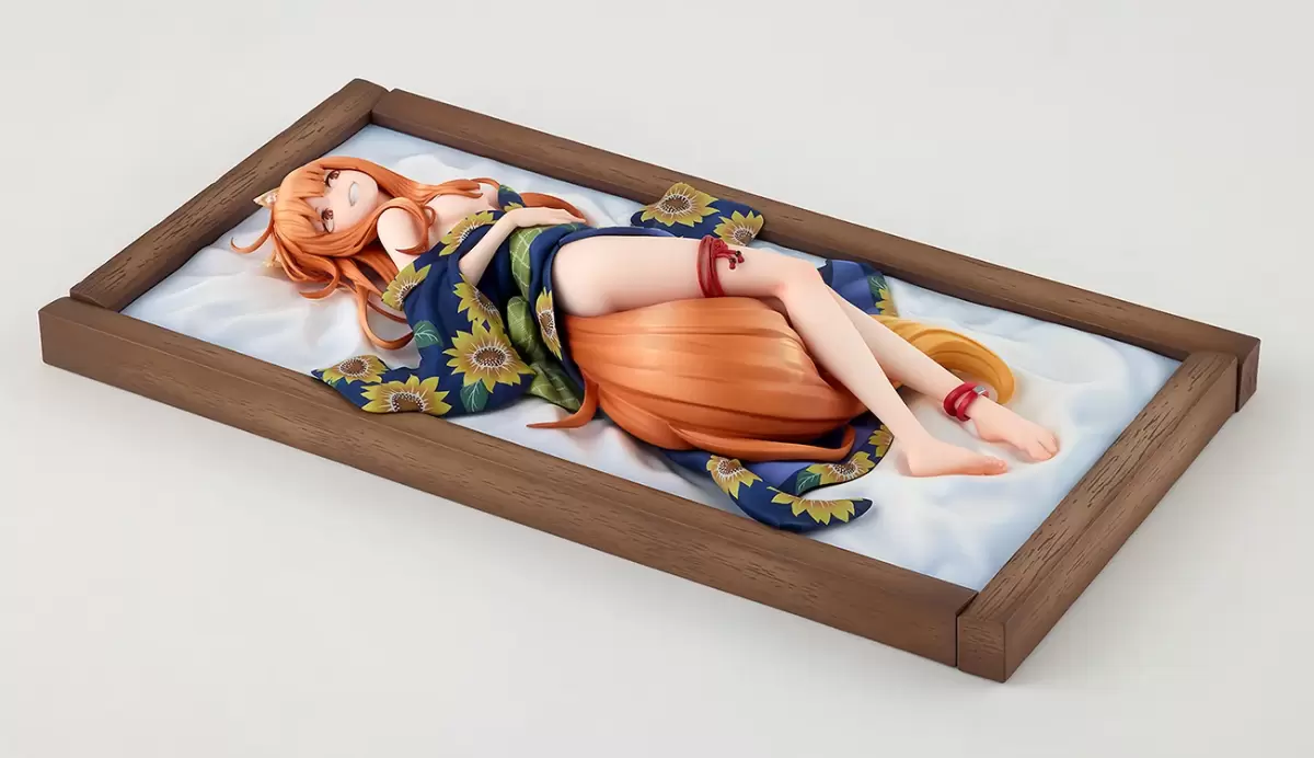 KDcolle 「赫蘿 浴衣美人Ver.」1/7比例模型,將赫蘿換上大膽的浴衣姿態立體化,再現躺在平滑床單上的撩人模樣,從散開的浴衣中露出的白皙肌膚,臉上還掛著挑釁般的(超級角度限定)邪惡笑容...讓人心跳不已!重點的部位藉由頭髮與毛茸茸的尾巴巧妙遮蔽,向日葵花紋的浴衣,尾巴澎鬆柔軟的光澤感等,充分展現赫蘿的魅力。底座以床鋪為形象,可以透過支架能直立展示。