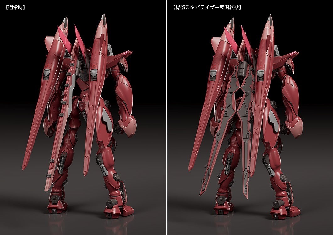 背部平衡翼無需替換零件便能展開,卡農增幅器展開、腕部內藏刀刃展開、主武器 Luger Lance 的射擊形態則能透過替換零件方式再現。此外商品中也附有印上多種機身標誌的水轉印貼紙,能夠貼在機體各處讓細節更加豐富。