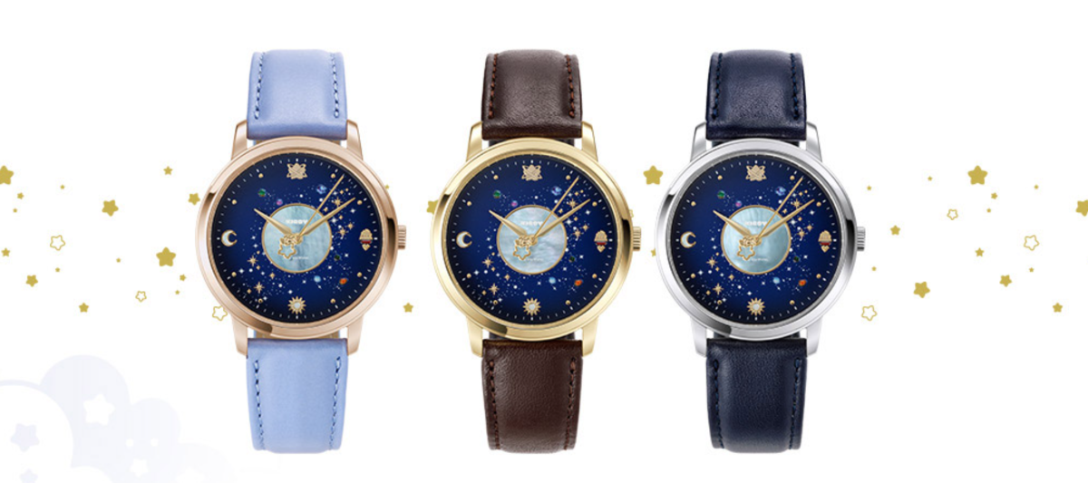 這次用上「銀河‧新星」的時鐘角色設定來設計手錶,也是相當匹配的作法。錶盤上鑲嵌著銀河系的星星,中央更是帶有透明光澤的珍珠母貝,營造出成熟的優雅氣質。