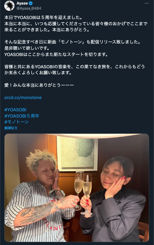 而YOASOBI由作曲者Ayase和歌手ikura組成,近日兩人慶祝團體結成五週年的X貼文,卻引起部分日本網友不安。