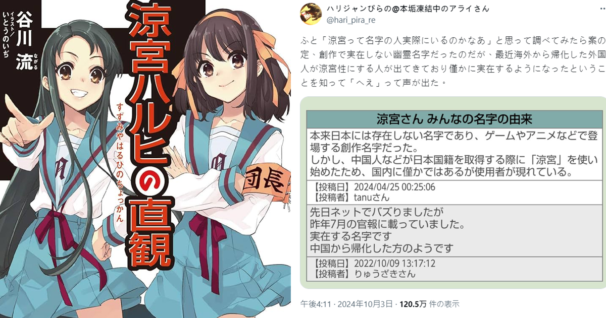 近日日本 X 上,有網友就討論起像是輕小說作品代表的《涼宮春日》系列中的「涼宮」這個姓氏,似乎在日本根本不存在,卻好像又能看到社會上出現這樣的姓氏,到底是怎麼回事?