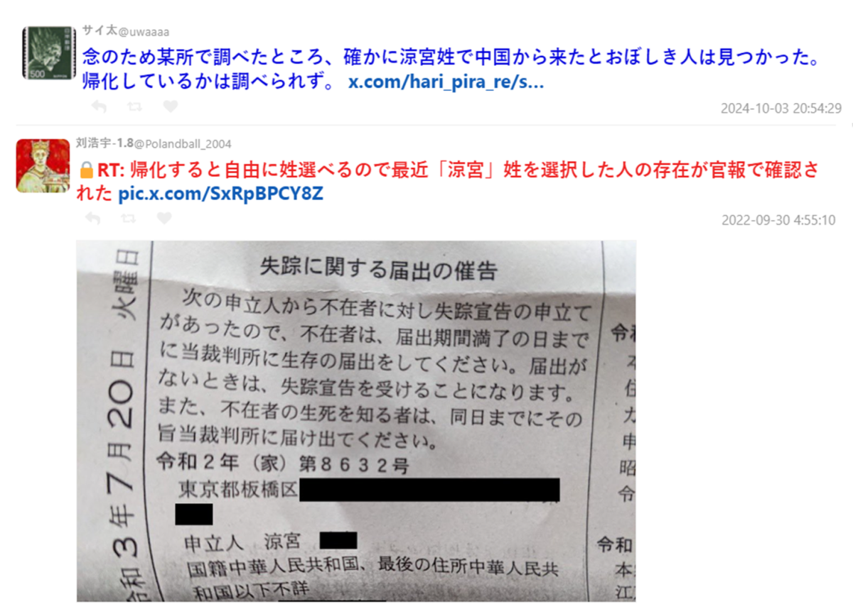 根據網友查詢,的確過去日本新聞報導中曾出現「涼宮」的中國歸化入籍者。