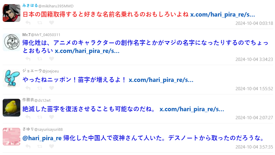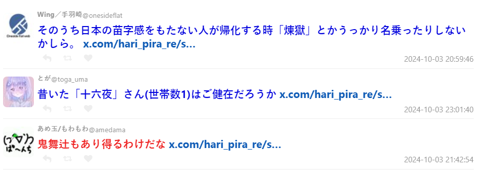 亦有網友開玩笑,未來入籍日本的人士,可能會選擇「煉獄」、「鬼舞辻」等當前人氣的動漫作品角色姓氏,選擇只會越來越多。