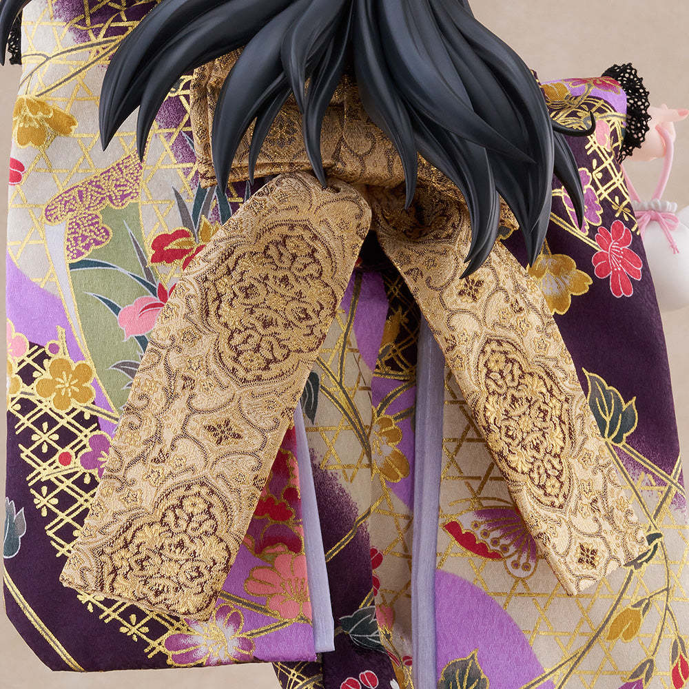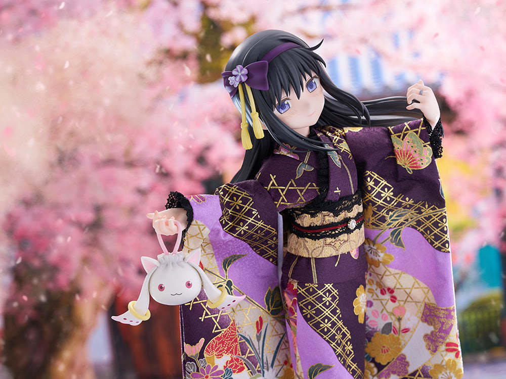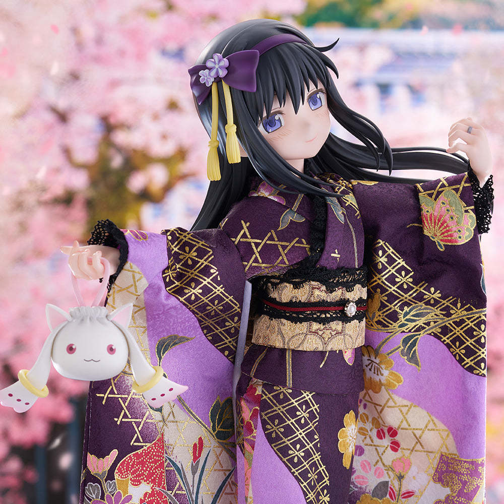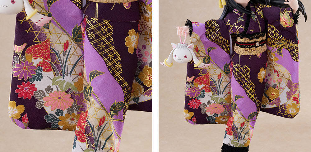 本次與吉德合作的第十七彈的曉美焰日本人形 1/4 比例塗裝完成品高約 43 公分,同樣由原型師モワノー雕刻製作出曉美焰腳踩加高木屐、手持丘比造型和服包的模樣,身上由人形作家宇山あゆみ創作的和服保留了魔法少女變身後的影子展現出和洋混搭風格的和服穿搭,在領口和裙擺處大量使用蕾絲來表現細節。振袖部分則是京都西陣織工坊「もりさん」使用「型友禅」技法染製,以深紫色為基調,描繪各種花卉與蝴蝶的設計,呈現出華麗但穩重的氛圍!