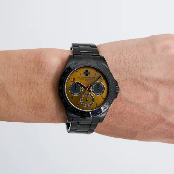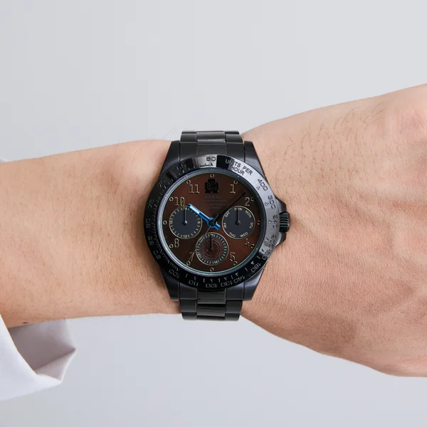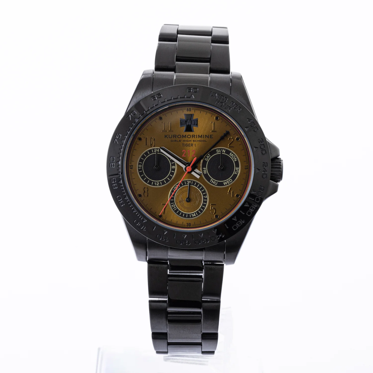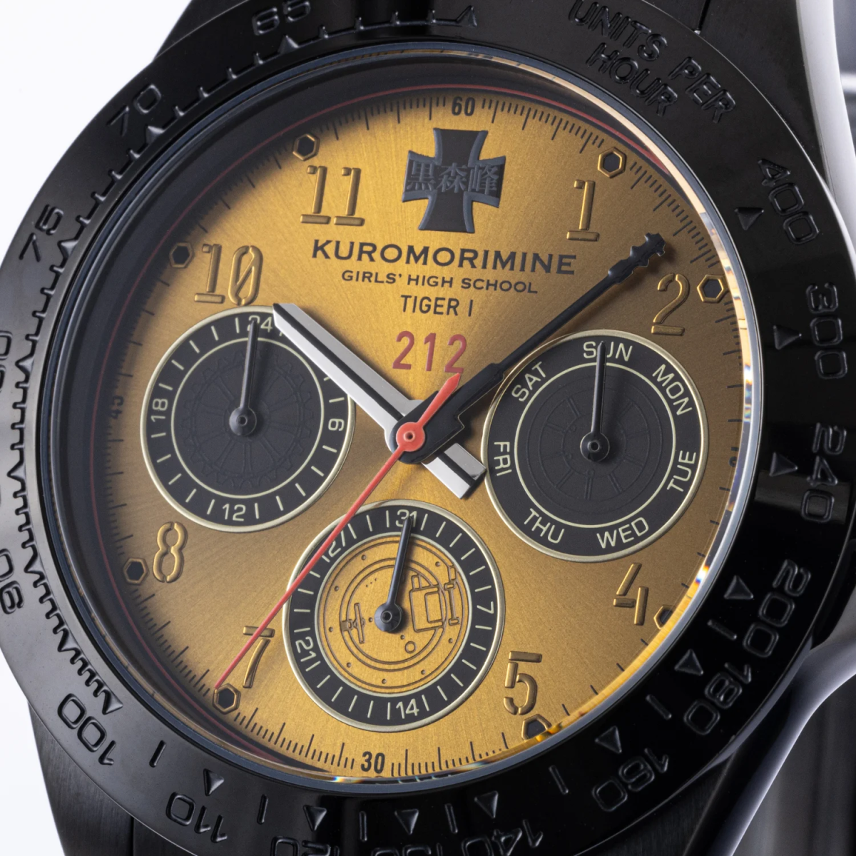 以黑森峰代表性的虎I戰車為靈感,錶盤背景以深黃色車身為基礎,12 點鐘處是黑森峰的校徽,3 點鐘、6 點鐘和 9 點鐘位置設有類似車輪的小錶盤和車身頂部的艙門,還有象徵主砲的分針獨特設計,表現非常到位。