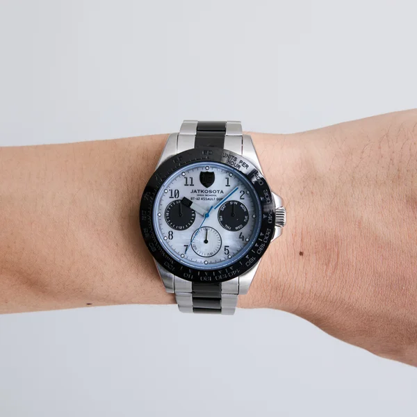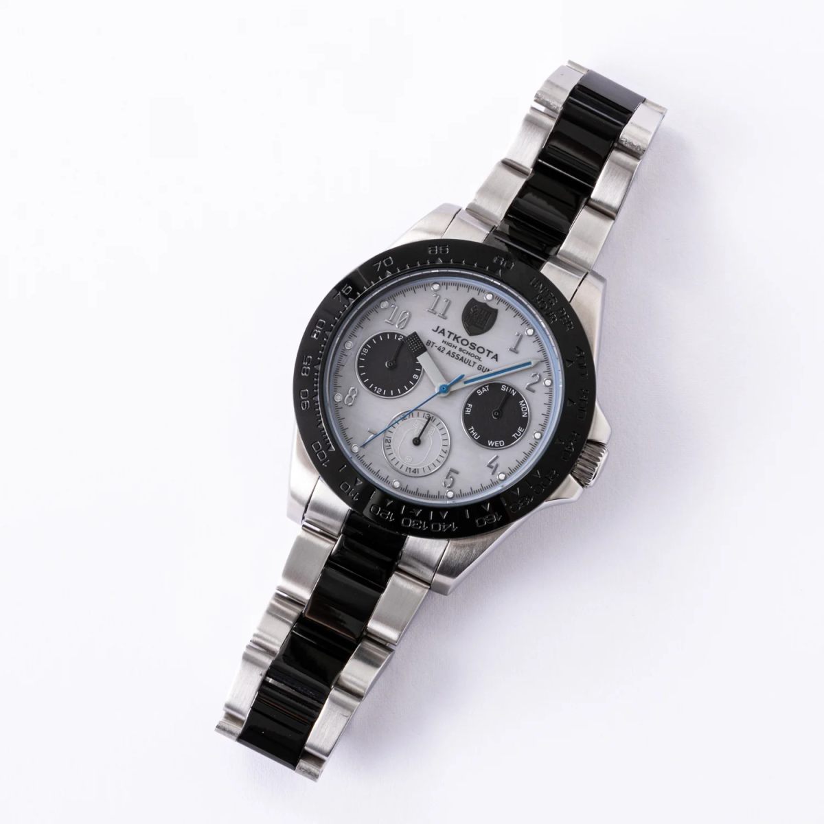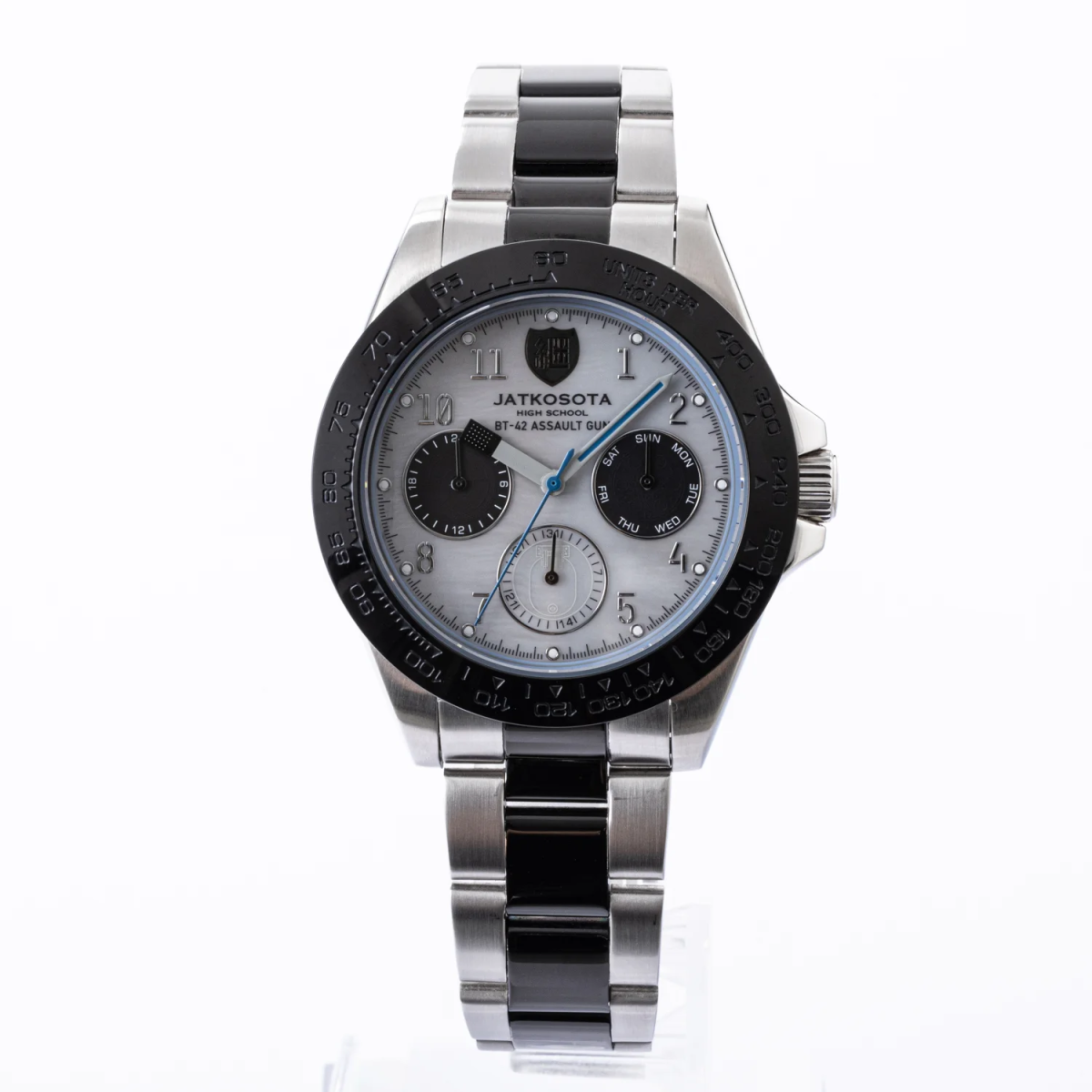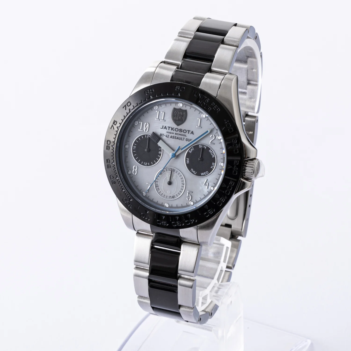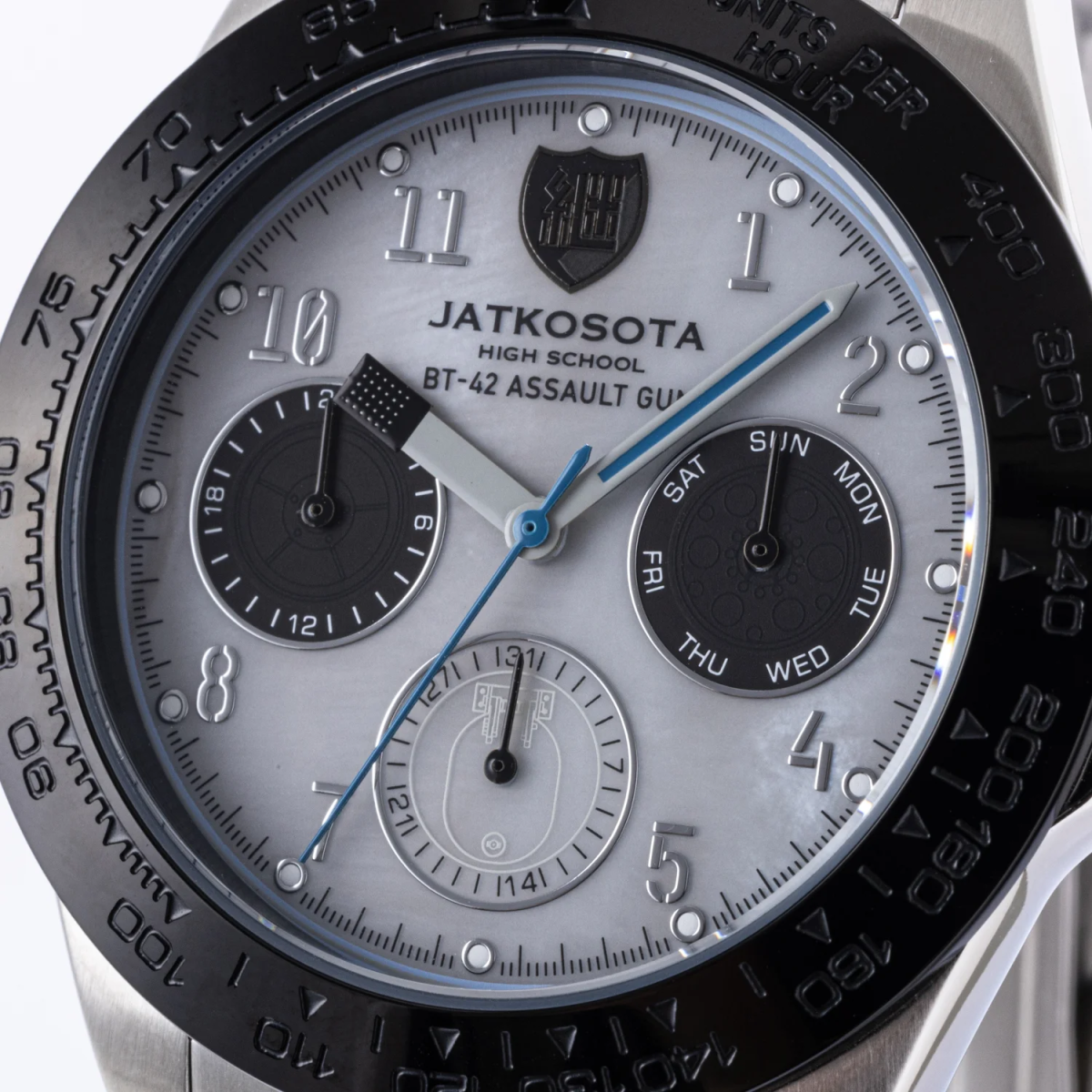 以繼續代表性的 BT-42 突擊炮為靈感,採用與機身顏色相似的色系打造外觀,12 點鐘處是繼續高中的校徽,3 點鐘、6 點鐘和 9 點鐘位置設有類似車輪的小錶盤和車身頂部的艙門,還有象徵主砲的時針獨特樣式,設計感非常出色。