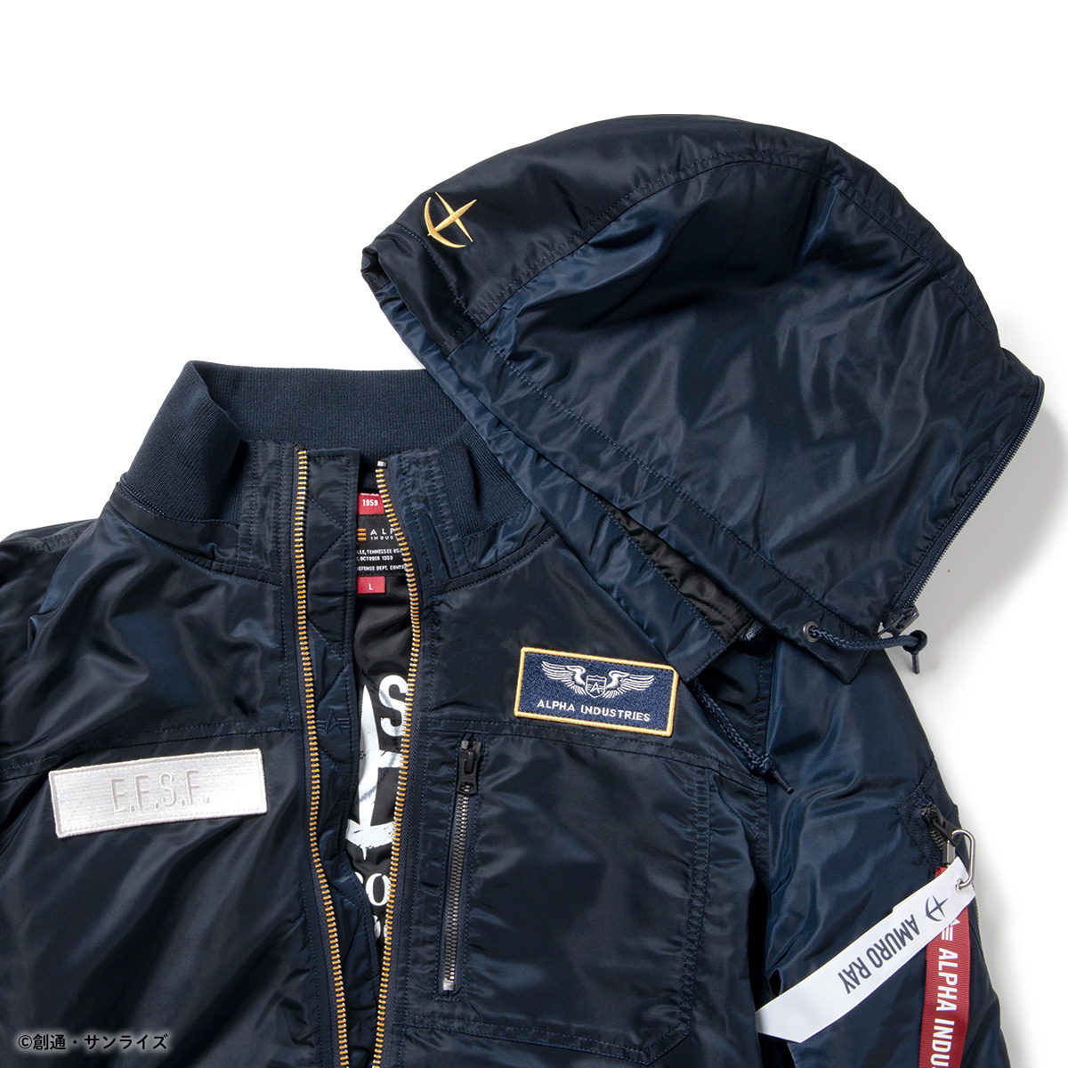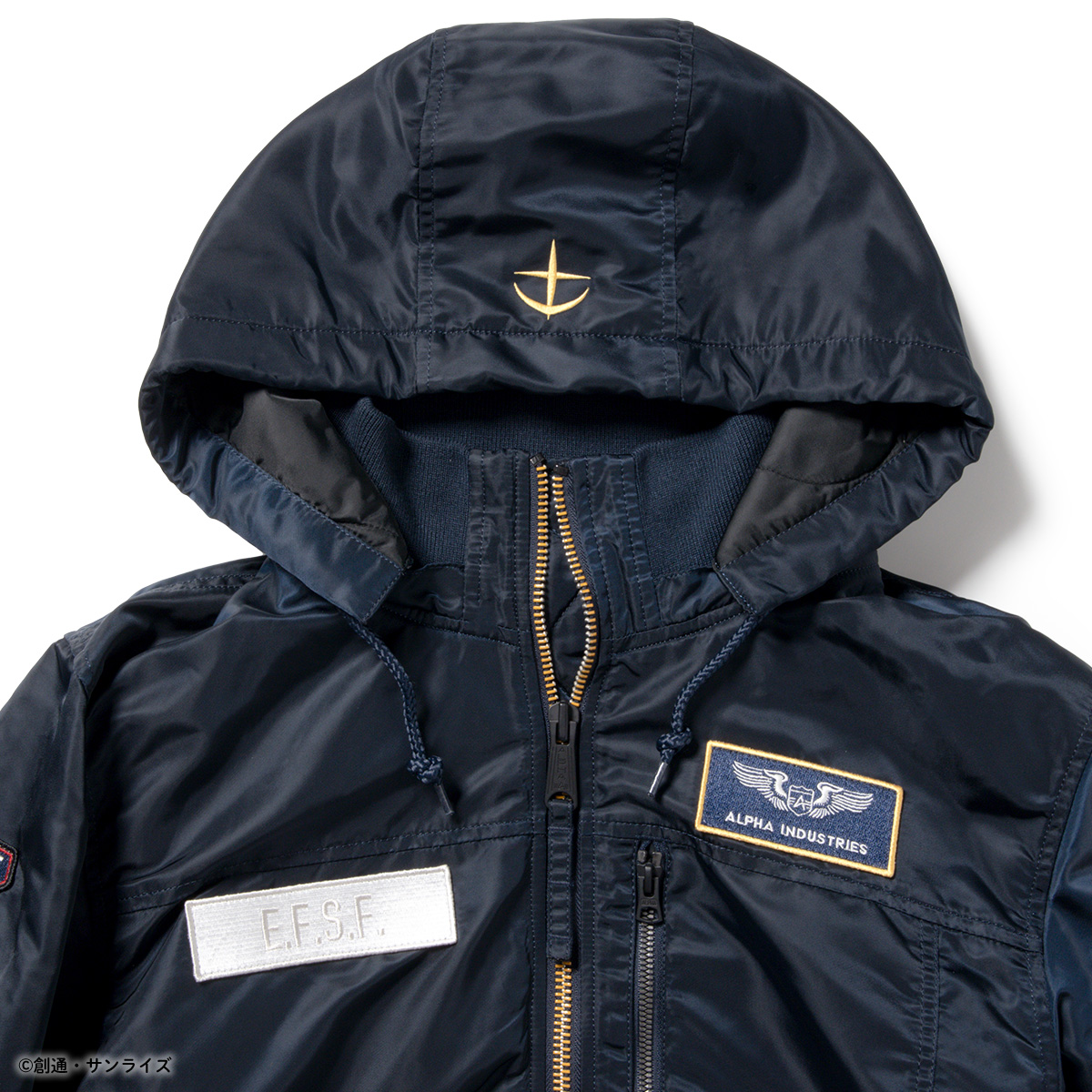 外套本體各處也都有著各式各樣的布章與圖案。包含右胸的聯邦軍的文字布章,右肩也配有聯邦布章,左手臂的飛行拆除布條也有 AMURO RAY 字樣。全部都以深藍色為基調呈現,連帽頂端有個細小的聯邦圖騰刺繡,外套內襯也還有細節,低調又不失特色。