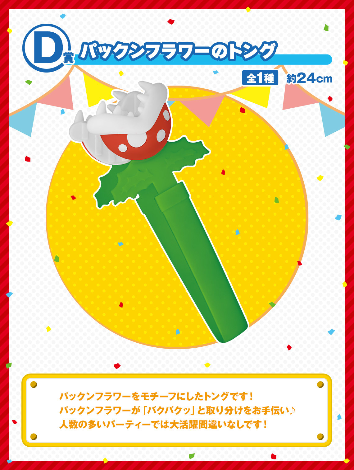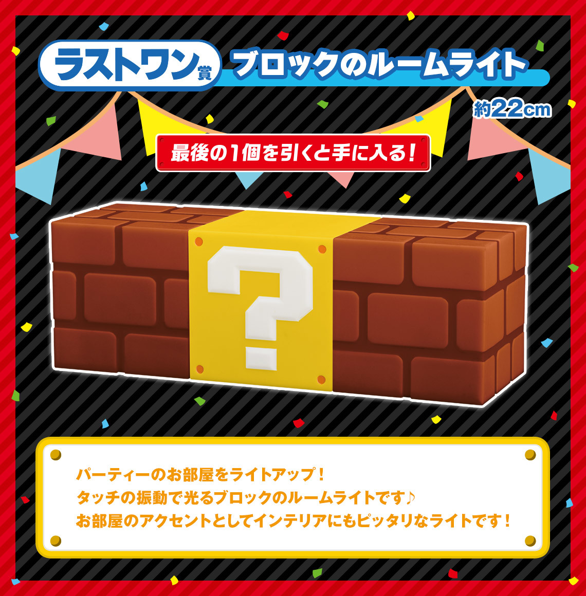 D~G 賞分別為食人花造型夾、道具造型吐司模具、派對旗毛巾、角色造型盤,最後一賞則為問號方塊及地磚造型的小夜燈,觸摸便會震動亮起,點亮陰暗的房間!每款賞品都圍繞著瑪利歐與派對,喜歡瑪利歐的玩具人們不要錯過啦!
