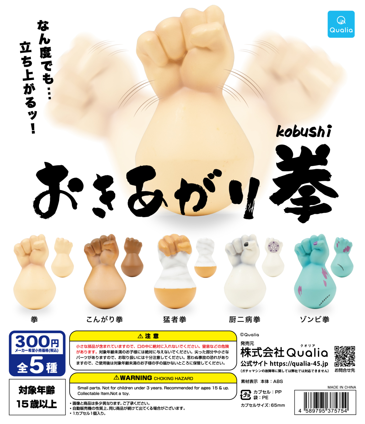 本次 Qualia 推出的「不倒拳」取自不倒翁(おきあがりこぼし)的諧音,尾部的「こぼし」(Koboshi)改為拳頭的「こぶし」(Kobushi),將不倒翁的概念與拳頭的意象結合,製作出無論怎麼推都不會倒下的拳頭不倒翁,展現出堅忍不拔的意志!收錄一般的「拳」、曬成小麥色「金黃拳」、看起來有鬥士氣場的「猛者拳」、手背印有魔法陣的「中二病拳」以及藍綠色殭屍造形的「殭屍拳」五種款式,同時放在桌上推也可以產生類戰鬥的玩法,快來握住屬於你自己的堅毅拳頭吧!