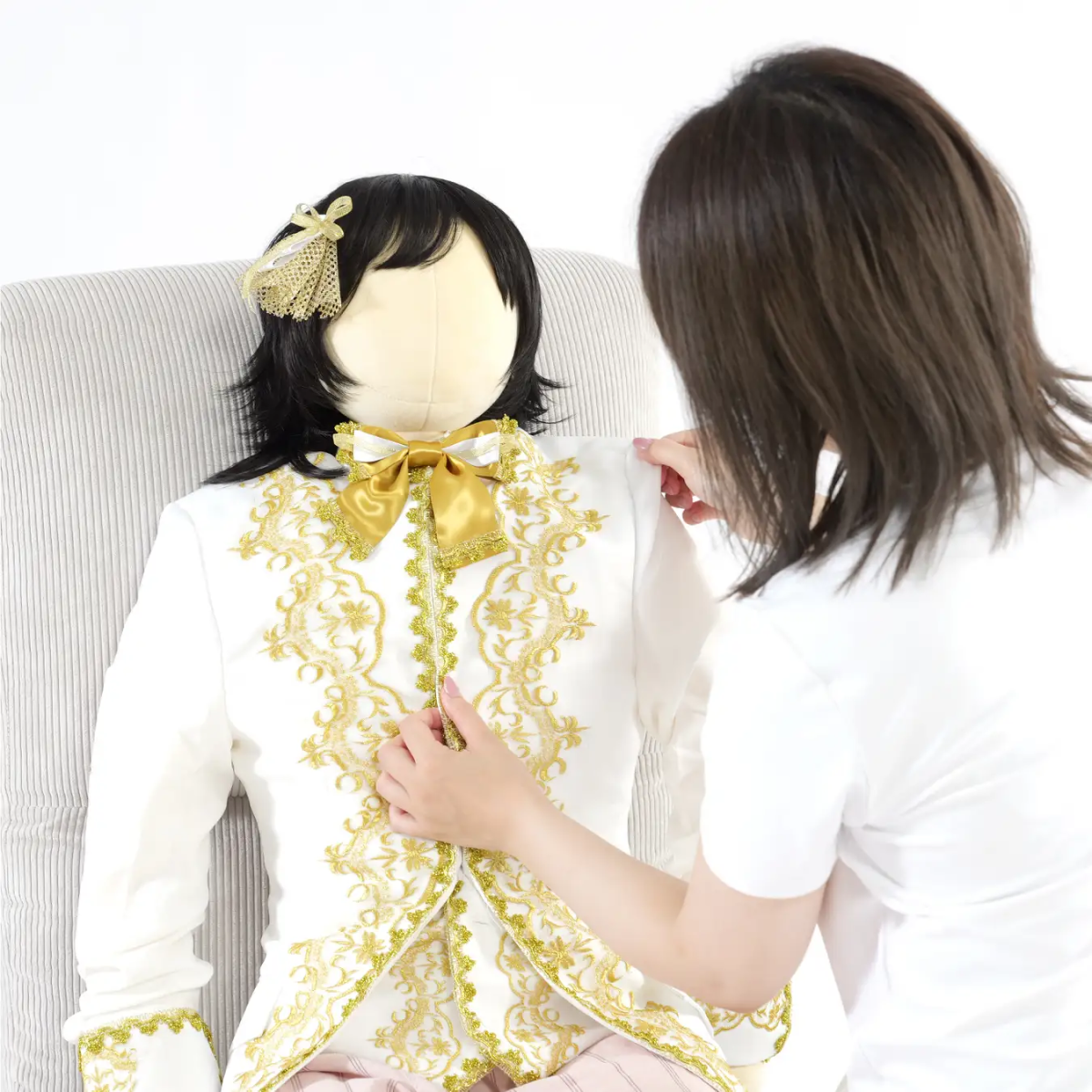 做成真人大小當然就是為了讓各位替它治裝,可以自行扮成你的推的模樣,頸部有內置芯棒,確保即使坐著,也不會軟塌。