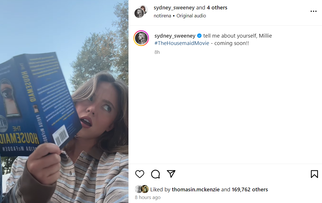 新生代女神 席妮史威妮(Sydney Sweeney)片約不斷,今日稍早宣布與獅門影業(Lionsgate)正式簽約,確認加盟 芙蕾達·麥克法登 (Freida McFadden)暢銷驚悚小說《家弒服務》(The Housemaid)的改編電影。並將與《媽媽咪呀!》(Mamma Mia)女星 亞曼達賽佛瑞(Amanda Seyfried)同台共演。