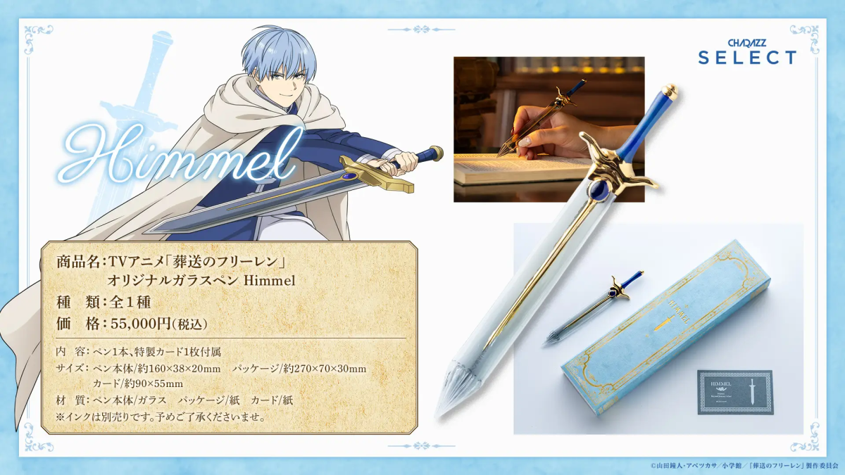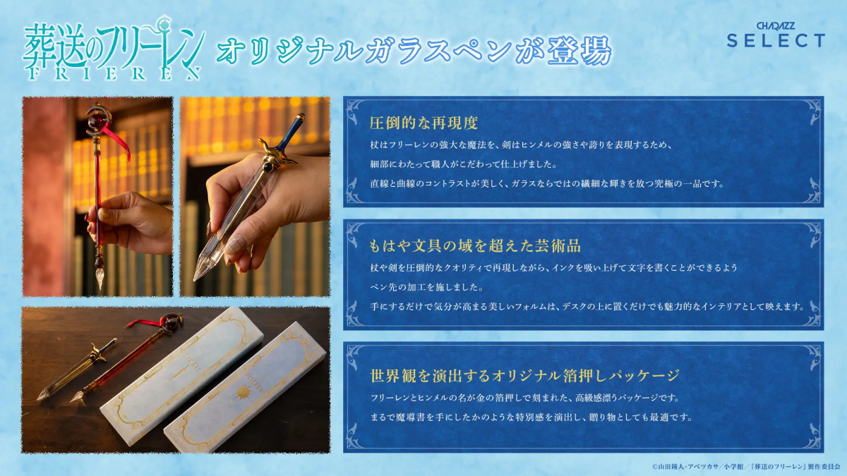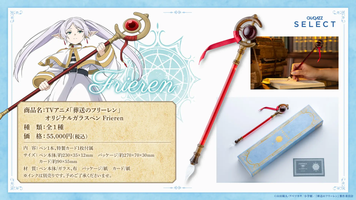 近日宣布與專門製作動漫 IP 周邊商品的品牌「CHARAZZ SELECT」合作,推出以芙莉蓮 & 欣梅爾的造型玻璃筆,還原原作兩人手持的武器。售價為 55,000 日圓,目前已可於官方線上商店預購。