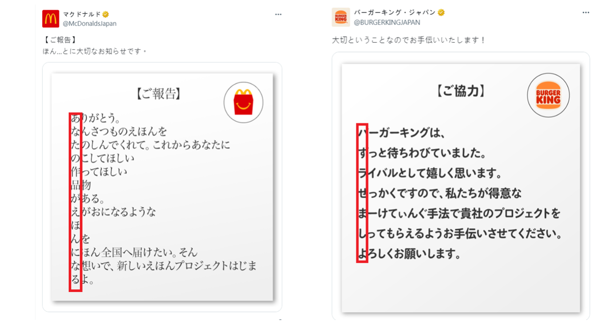 結果同日過不久,日本漢堡王就轉推麥當勞的貼文,表示認為這件事情非常重要,也想幫個忙,發了一個協力公告,這斷句看起來也有奇妙的巧思。果然也是第一個字藏頭,寫到「一起讓這個熱鬧起來吧」,沒想到漢堡王的社群反應如此神速,才沒多久就立刻跟著麥當勞發文起鬨,真的專業 XD。