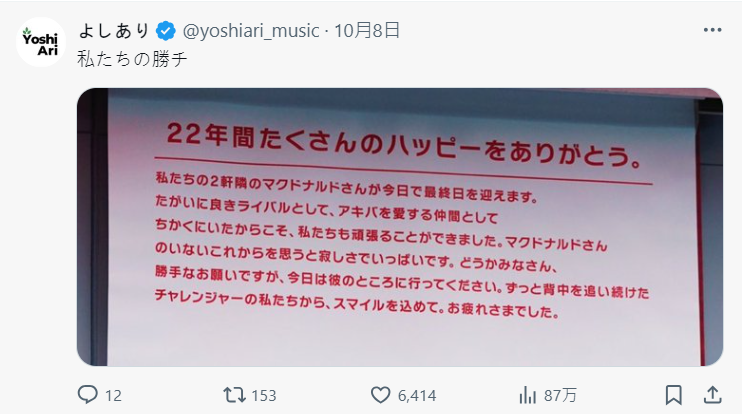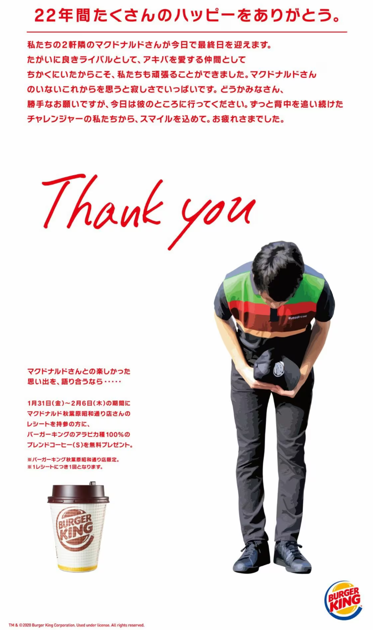 關於藏頭文,日本漢堡王還真的是高手,先前分店附近有麥當勞歇業,還貼出一個看似感謝麥當勞的公告,結果藏頭寫著「我們的勝利」,就讓不少人見識了漢堡王這方面的能耐。