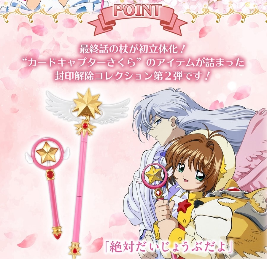在 2023 年的第一彈推出封印之杖、星之杖、夢之杖及庫洛牌等經典道具後,本次的「《庫洛魔法使》封印解除收藏 2」以〈小櫻牌篇〉為主軸推出五款道具模型!再度收錄的星之杖上的星號作有旋轉功能,前端可以以磁吸方式與同步推出的小櫻的封印之書結合把玩!這次也收錄了作品中知世與小櫻用來通話、作有可按壓按鍵的粉紅金剛通信電話,以及經典插圖中小櫻著用、底部的輪子可以轉動的直排輪!而小櫻在〈小櫻牌篇〉第 23 集中小可與審判者月為了幫助小櫻進入魔法杖形成的日、月、星 3 種力量合而為一的魔法杖也將正式的立體化收錄在其中,組裝完成後能夠達到 15.5 公分的大尺寸!五種款式都非常用心的在還原劇中造型的同時加上小小巧思提升可玩性,喜歡《庫洛魔法使》的各位玩具人千萬不要錯過!