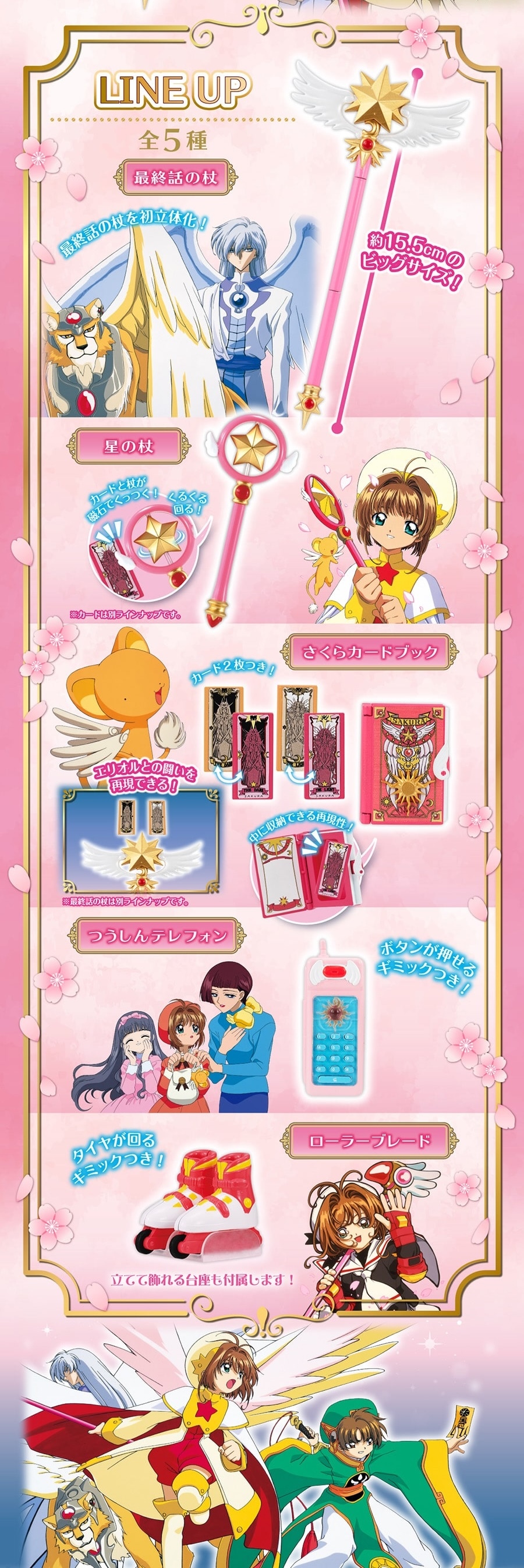 《庫洛魔法使》是由漫畫團體 CLAMP 所原創,日本動畫公司 MADHOUSE 改編的魔法少女題材作品。講述女主角木之本櫻為了阻止庫洛牌四處破壞,成為庫洛魔法使嘗試收回所有的庫洛牌的故事。隨著故事推進,小櫻所使用的魔法杖以及牌組也有所成長及變化,在每季新動畫推出時也一同推出多款不同的玩具。