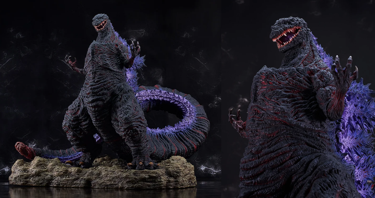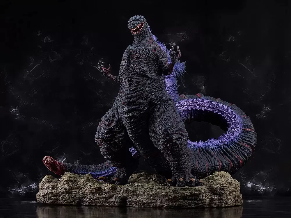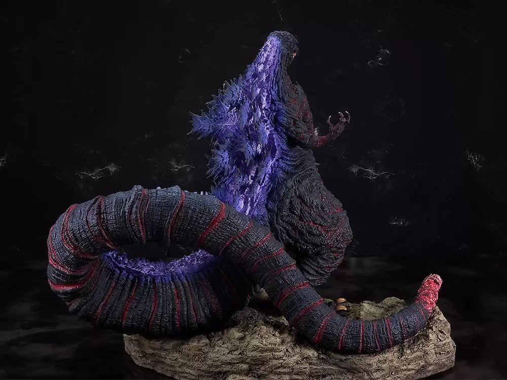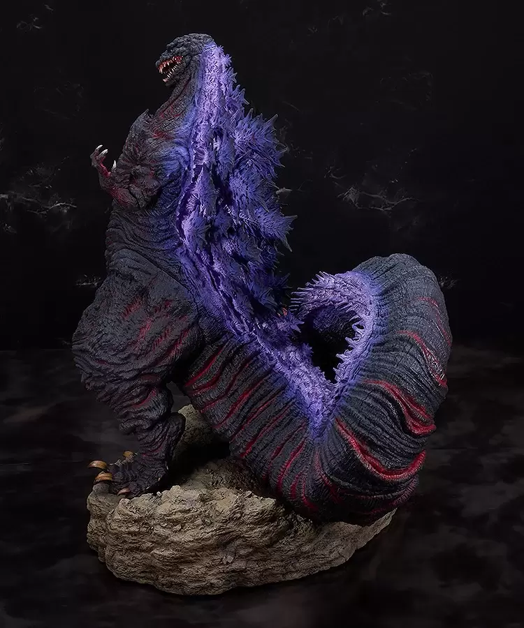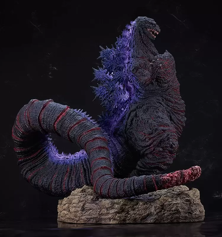 與新・日本英雄宇宙的另外三位角色:初號機、超人力霸王、假面騎士相同,由上色師 せしる(Seshiru)操刀色彩,在焦黑的軀體間施以極具生物感的血色;在背鰭使用即將覺醒的紫色塗裝,表現出由內而外發出光芒的色彩,釋放極為強烈的存在感。四位英雄採用可以共同擺飾的石塊地台,一起收藏就能完整重現充滿魄力的主視覺插畫!