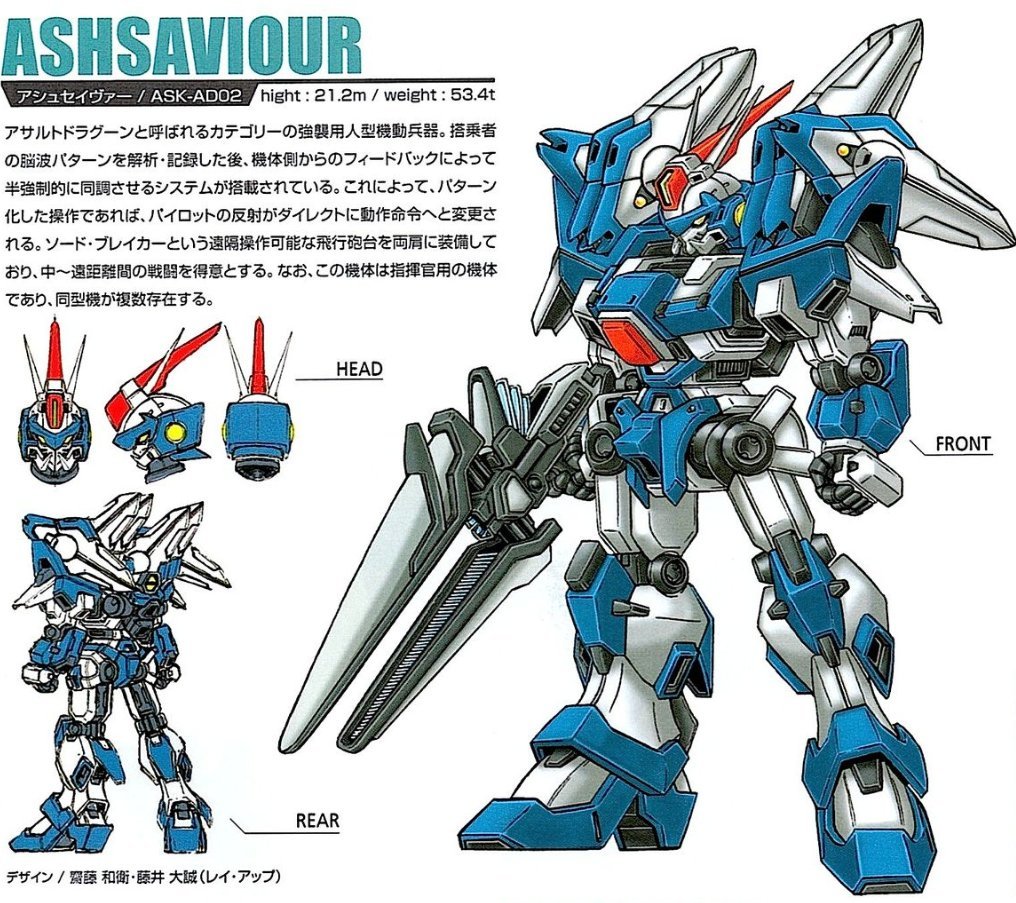 最早登場於《超級機器人大戰A》的ASK-AD02 灰燼救世主是玩家最初可選擇的真實系主角機之一,雖說 HP、裝甲、最大攻擊力是五架主角機中最低的,但極高的運動性帶來優異的迴避性能,更搭載使導彈無效的干擾裝置、減輕光束傷害的抗光束鍍膜。最強武器「破劍者」更是彷彿鋼彈系列感應砲的帥氣武裝,具備可移動後攻擊、2~6長射程、不會被斬落等超強特性。
