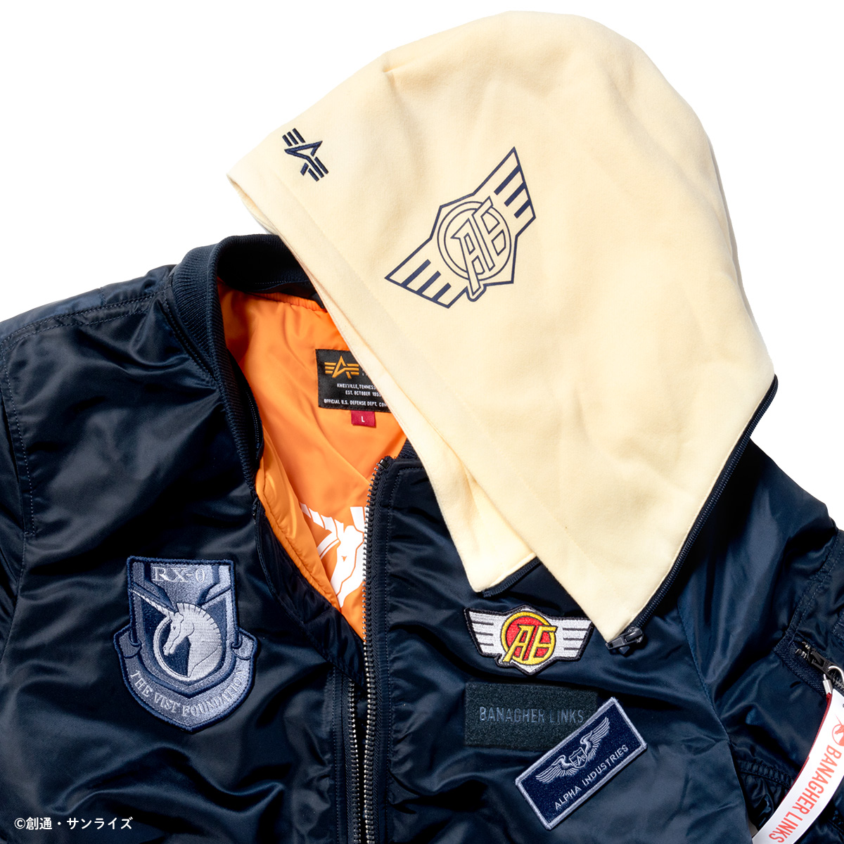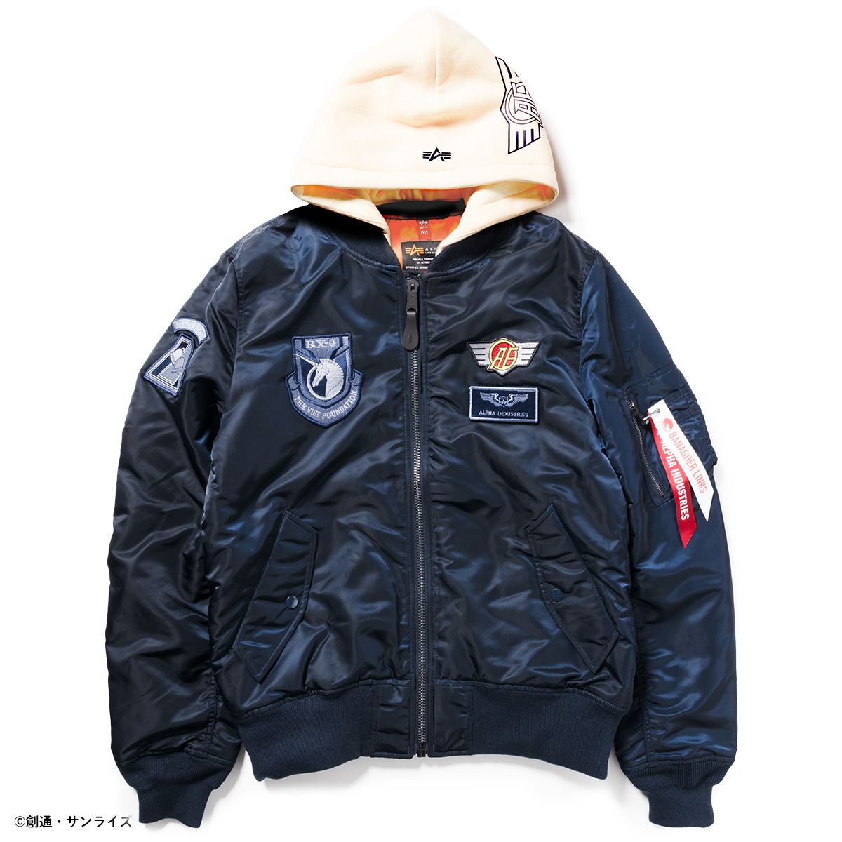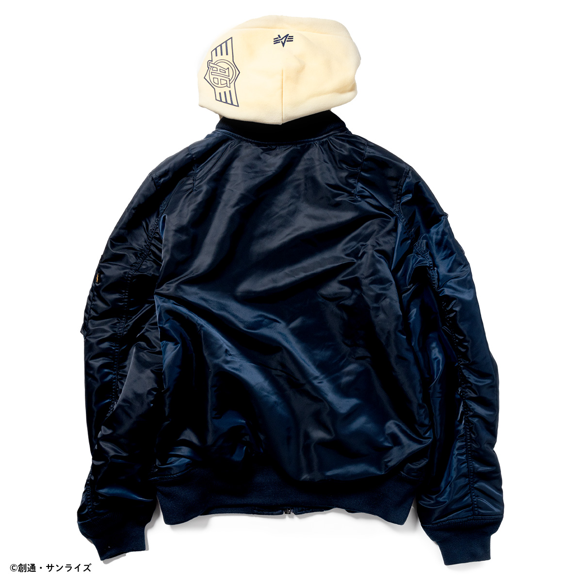 整件外套以深藍色為基礎,MA-1 NATUS 款最大的特色就是附有可拆卸的連帽設計,加上胸前與右手臂的主題布章配置,連帽上也配有亞納海姆的圖騰。