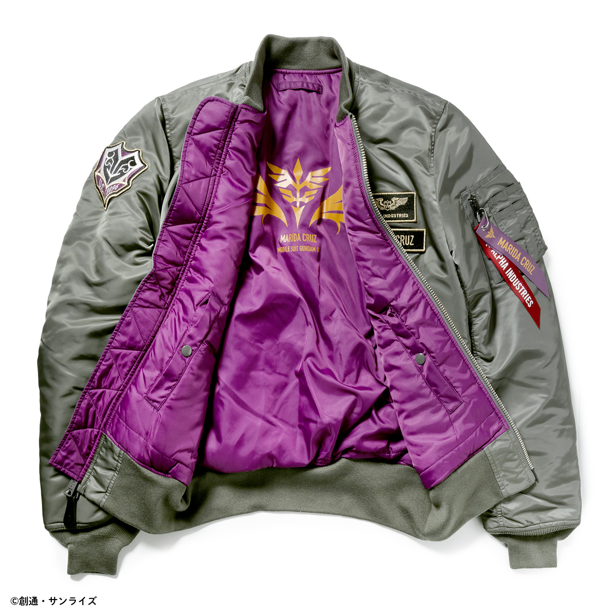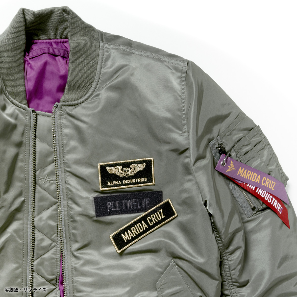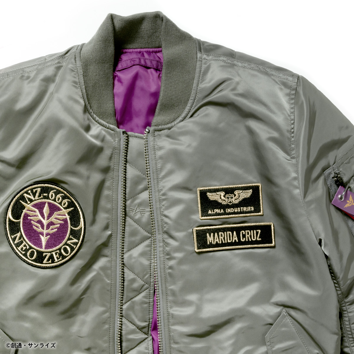 整件外套以軍綠色為基礎,選用正統 MA-1 版型,不僅左胸上有著 MARIDA CRUZ 的英文字樣布章,右胸也配有新吉翁的軍徽跟其駕駛代表機體 NZ-666 「剎帝利」的編號,右手臂跟外套內裡都配有瑪莉妲個人的標誌。