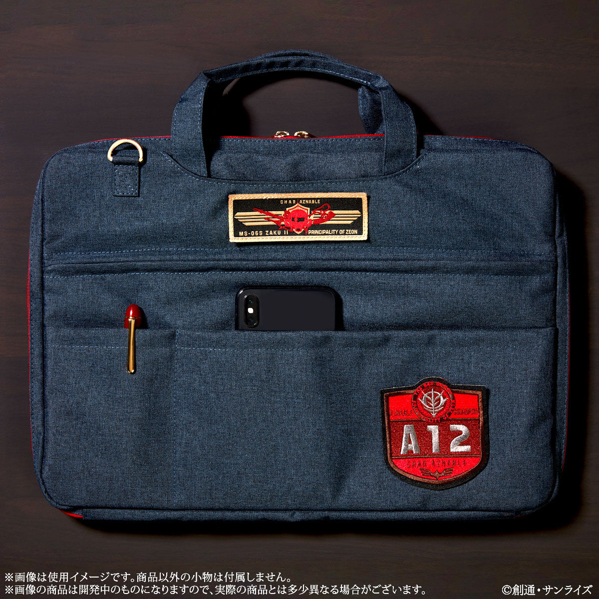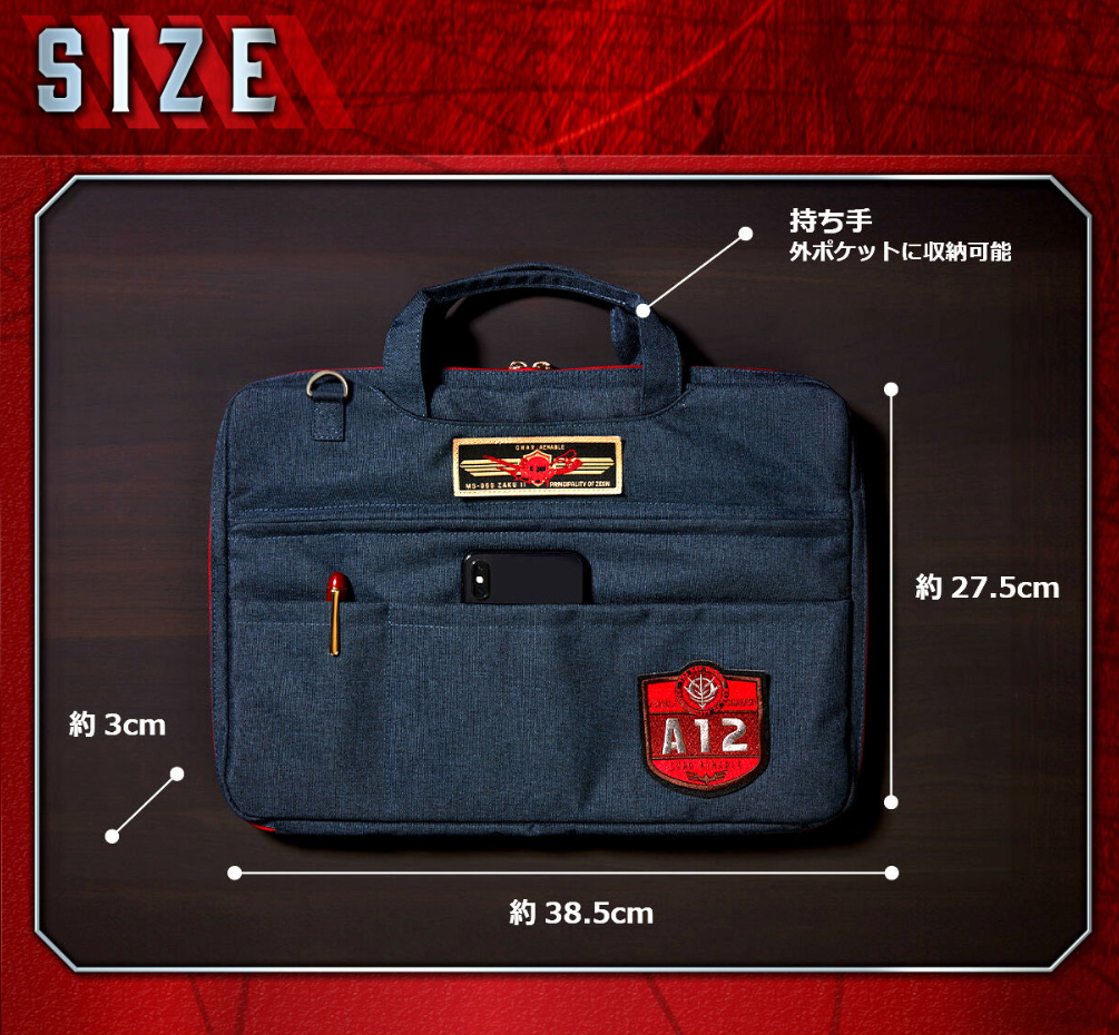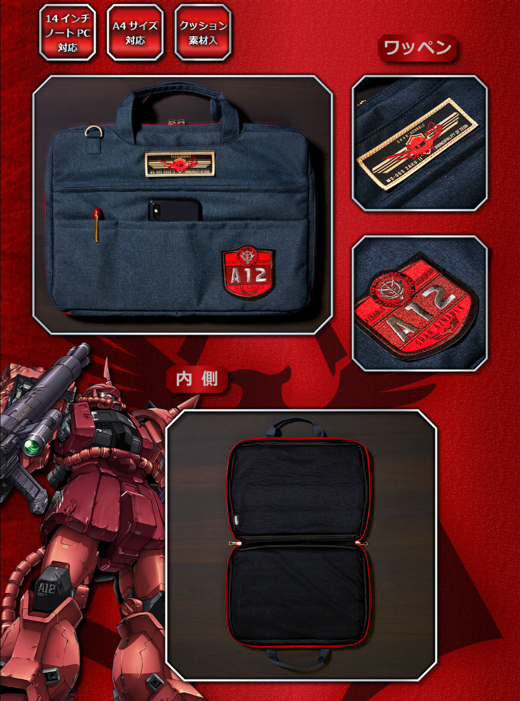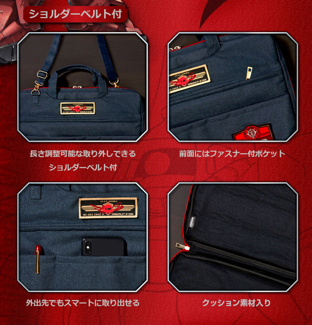 「夏亞專用筆電包」以夏亞為主題,本體基調為深藍色布料材質。具有軍事風格的布章是其最大的特色,分別有著 MS-06S ZAKU II 夏亞布章以及夏亞率領的 A12 部隊的特殊布章。