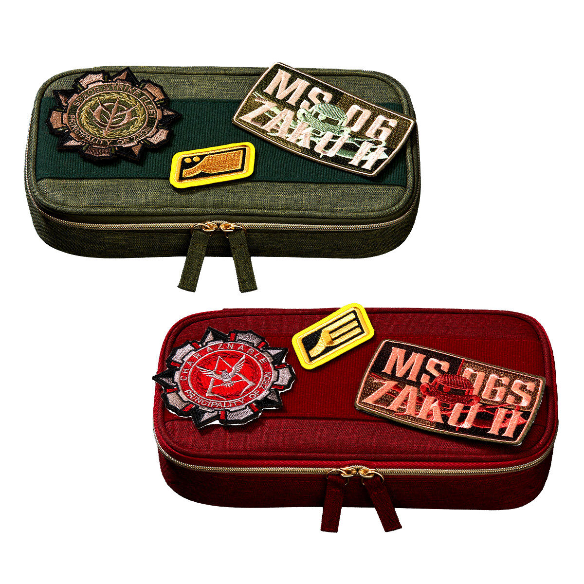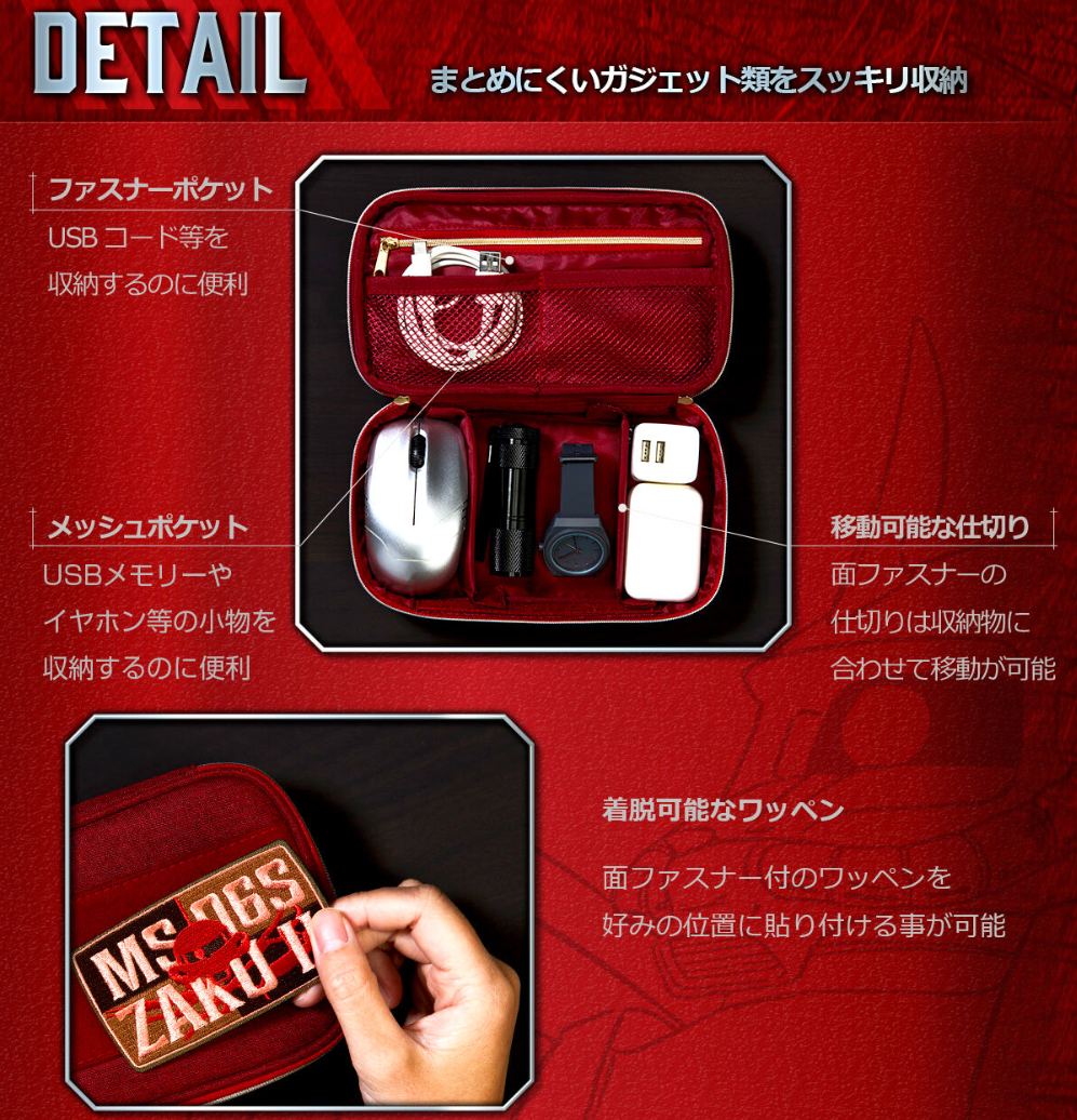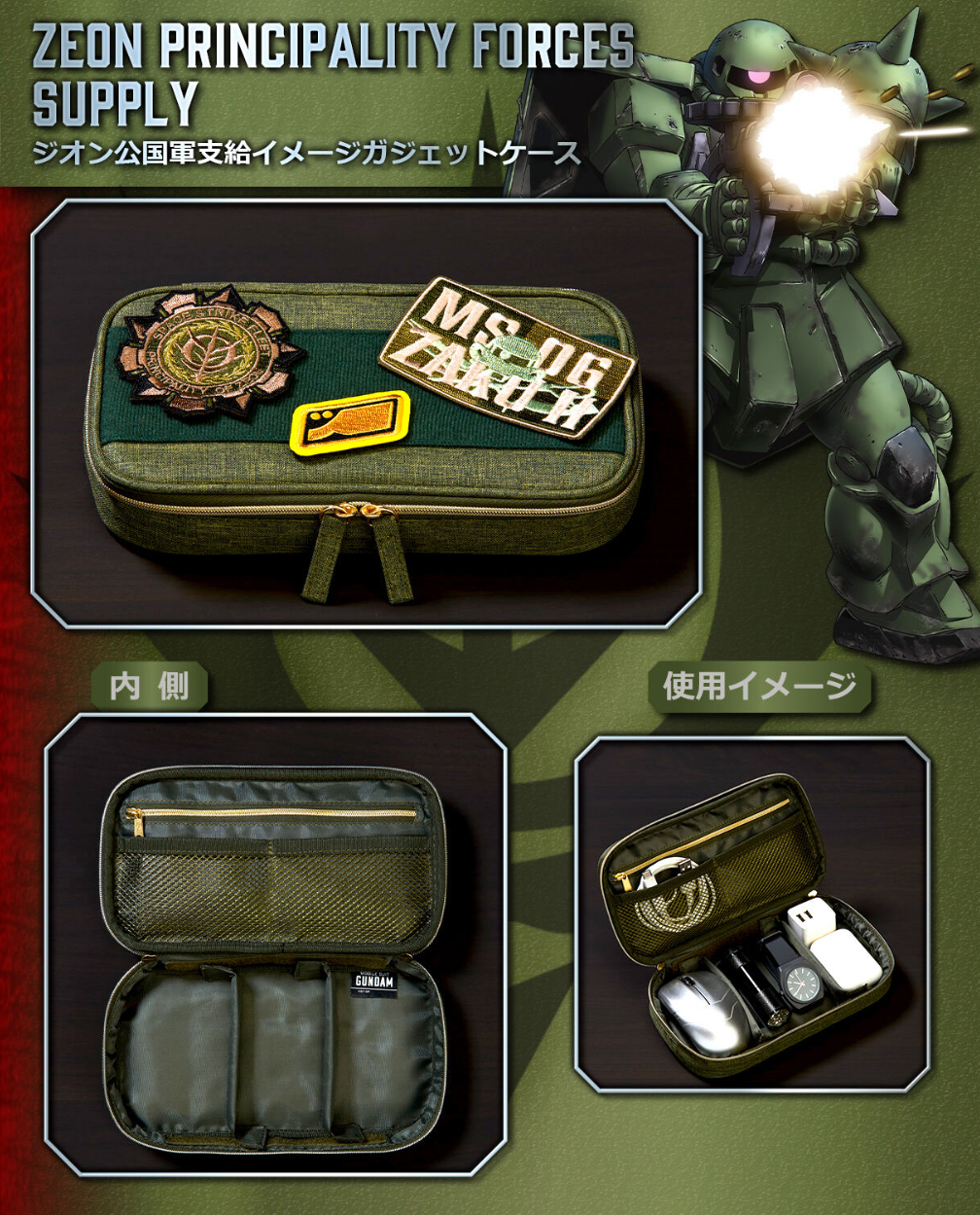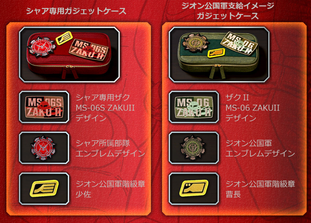 「小物收納包」以夏亞跟吉翁軍為主題推出兩款,分成採用紅色與軍綠色來呈現。兩者都以碩大的軍事風格布章呈現,可以自由黏扣,隨喜好更換位置來客製化你想要的樣子。