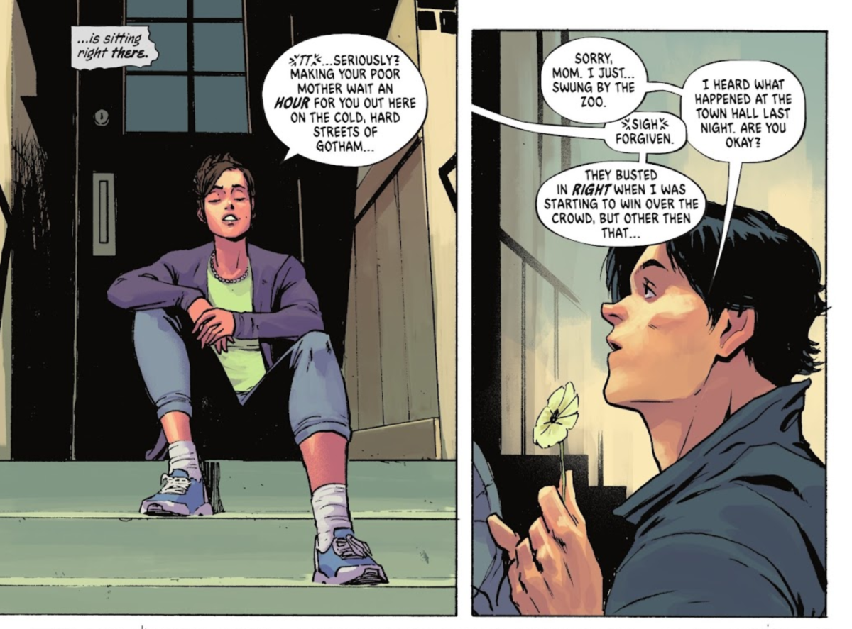 至於母親瑪莎·韋恩呢?慶幸的是,在這個「絕對宇宙」當中,並沒有狠心地讓布魯斯·韋恩一下子就沒了雙親,在故事中的瑪莎還活得好好的。布魯斯在父親遇害的地方獻上了一朵花,也隨之去探望了母親。