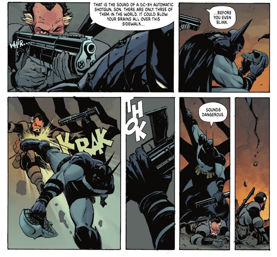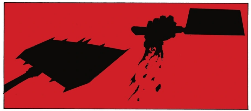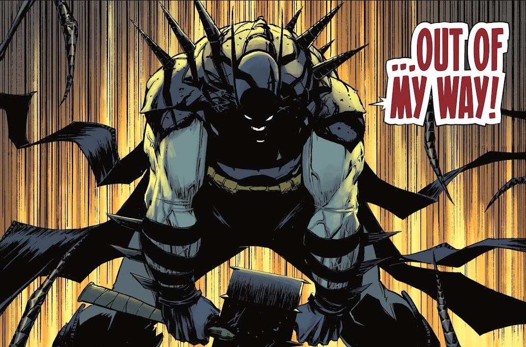 當布魯斯·韋恩穿上蝙蝠戰袍,化為黑暗騎士的那一刻時,想必是最吸引讀者粉絲眼球的橋段。在這邊的蝙蝠俠,不僅呈現出更為暴力、兇殘的一面,胸前的蝙蝠標誌還能夠拆下來——變成一把能夠斬斷敵人四肢、把敵方打殘的大斧。