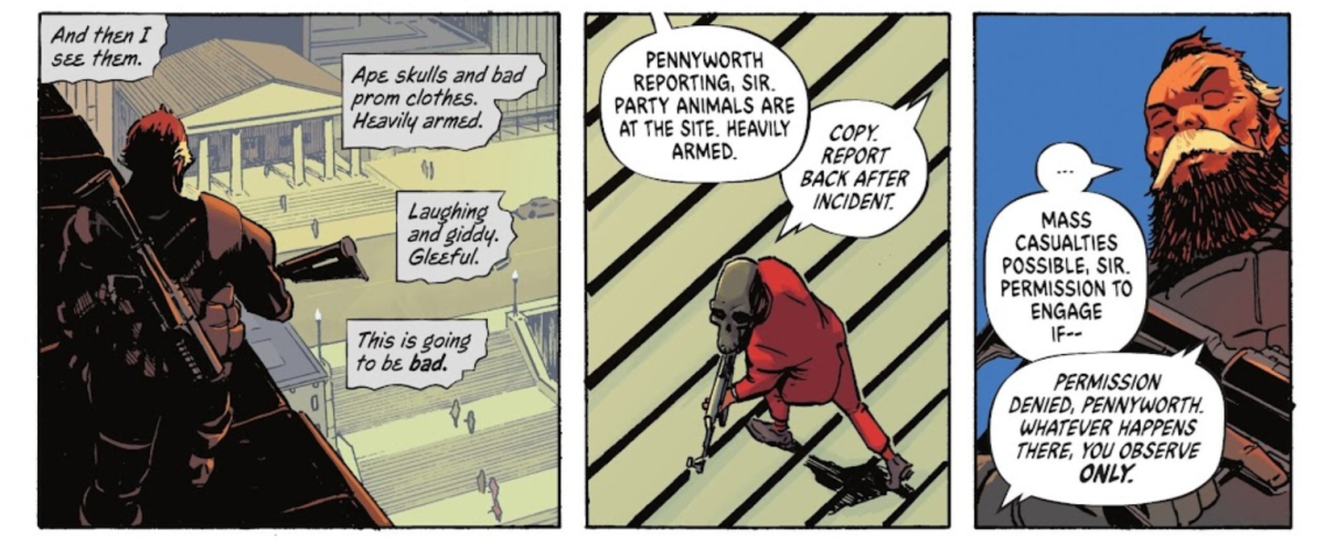 但唯一可以肯定的是,在這裡的阿福·潘尼沃斯,是一位擔任某一組織的秘密特務,雖然無法確認是否與舊世代一樣,都是為英國政府工作,或是隸屬於天眼局A.R.G.U.S.的特務,但至少可以知道,在這裡他得到了委託,負責弄清楚在高譚濫殺無辜的「派對動物(The Party Animals)」底細。