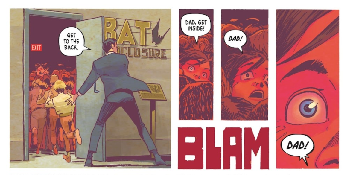 也因為韋恩家族的身分不同,雖然不再有「大珠小珠落玉盤」這種滿地珍珠項鍊的場景,但布魯斯的父親依舊死在兇手的槍口下,並在死前捨身保護包含布魯斯在內的孩子們。