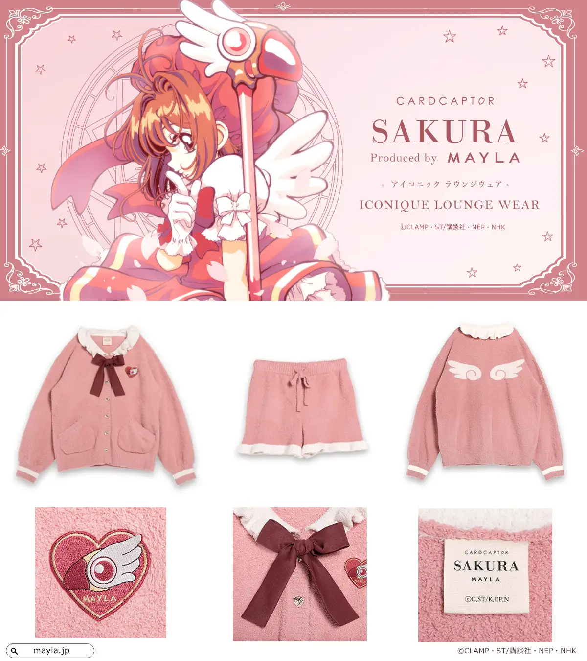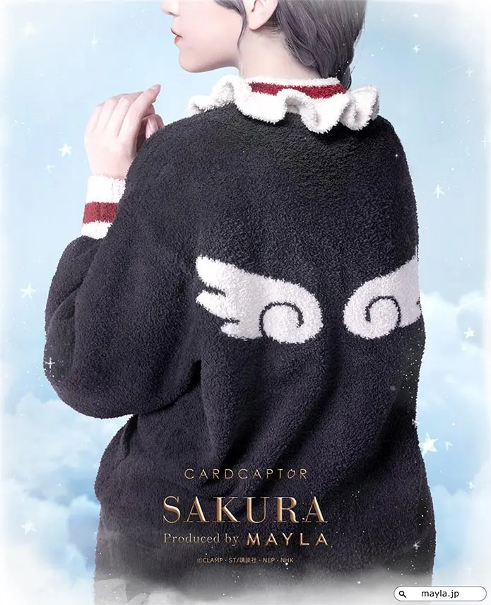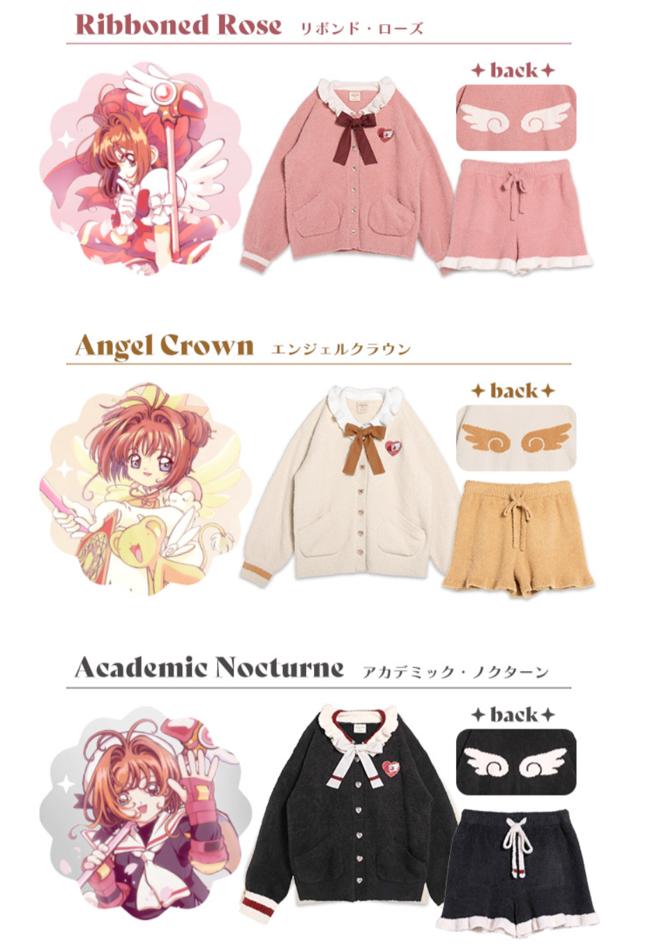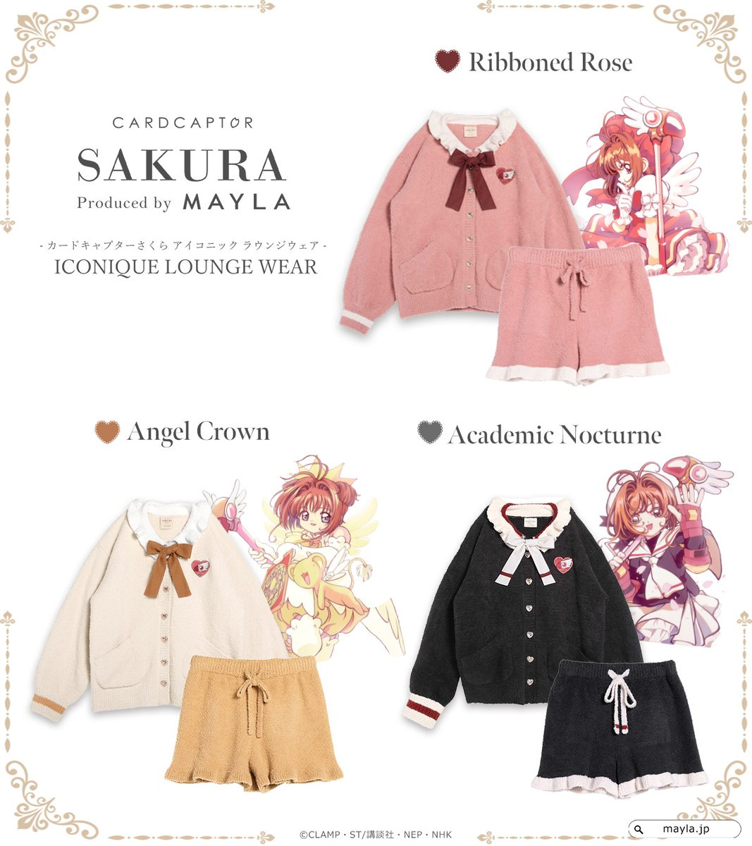 這次的家居服有三款樣式,分別為「Ribboned Rose」、「Angel Crown」與「Academic Nocturne」,三款都以原作中小櫻穿著的服裝為靈感出發打造,設計上細節也多有原作的細節,家居服成套分成上衣跟短褲,採用毛絨面料讓你秋冬穿上能夠禦寒。搭配 MAYLA 招牌的華麗風格設計,打造出魔法少女氣息的絕妙穿搭選擇。