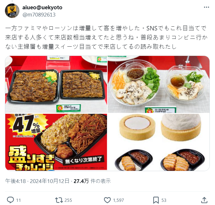 另一方面網友也點出,全家和 Lawson 都透過加量來吸引顧客。有很多人就是衝著這點在社群媒體上看到後才去店裡,來店數量也大幅增加。可以看得出來,平常不太去便利商店的家庭主婦們,也因為加量甜點而特地去購買。
