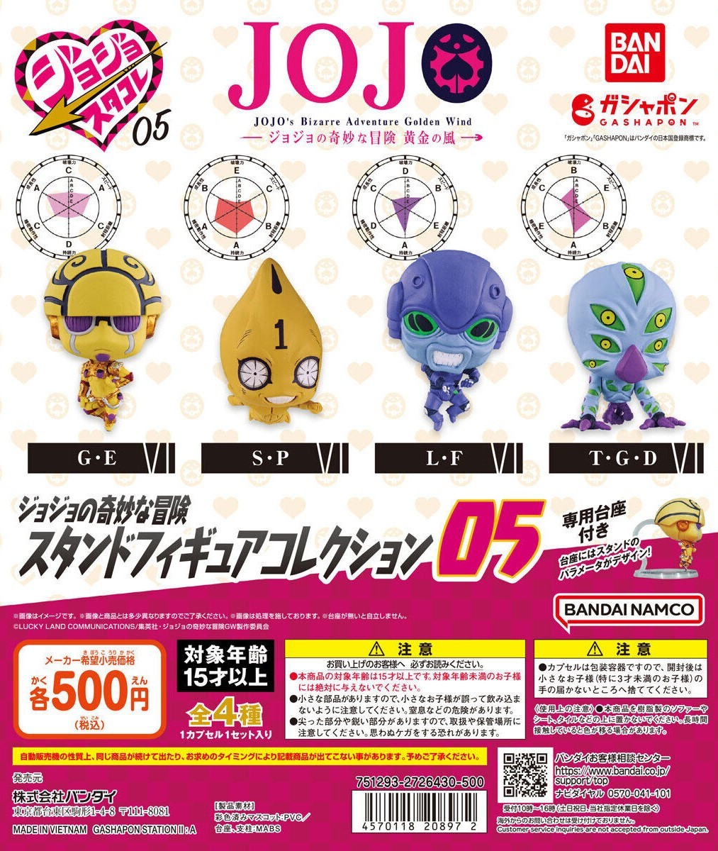 「JOJO的奇妙冒險 STAND Collection 05」轉蛋,採用大人氣繪師「ゆーぽん」著名的蚊香眼造型,以二頭身比例詮釋,將原本角色們的帥氣風格化為 Q 版立體化呈現!收錄有 JOJO 系列中的人氣替身,包含:黃金體驗 G・E、性感手槍 S・P、小腳 L・F、壯烈成仁 T・G・D,每款約高 4.5 公分,精緻的造形施以質感的塗裝,並附有專用支撐架和底座!