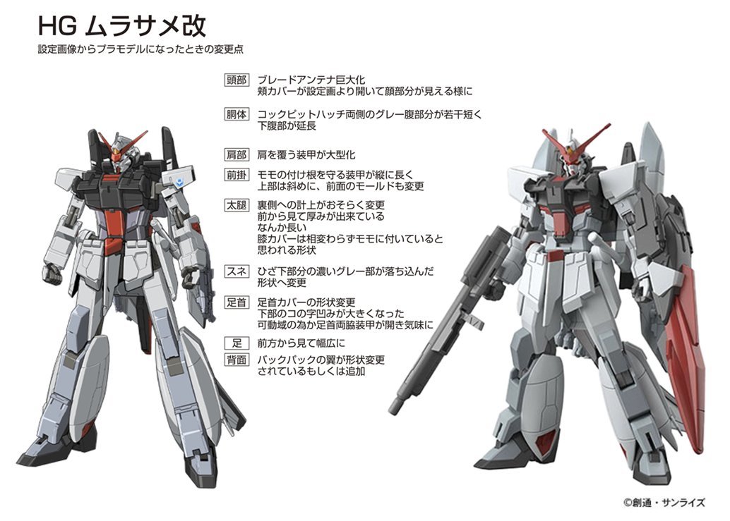 「HG 1/144 村雨改」新公開的實物樣品基本與過去的開發中 CG 圖相同,整體造型依舊採用模型原創風格,而非動畫運用的機械設定稿,頗具特色的小型化肩甲、前裙甲形狀、細長的腿部...等多處都被大幅修改,擁有更接近修改前「MVF-M11C 村雨」的輪廓。
