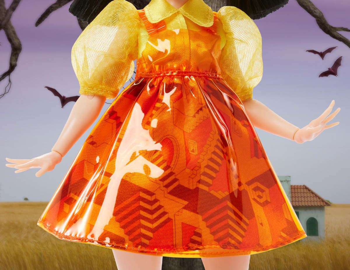 充滿童趣的洋裝被改以複合材質呈現,內側的黃色襯衫以布料搭配薄紗製作成公主袖的造型,吊帶裙以橘色彩透塑膠布縫製,可以透出底下受經典的樓梯場景啟發的紋路!長襪上印上了椪糖關卡的三種造型紋路,高跟鞋加入了蒙面管理員面具的元素,配件部分則是將劇中用來承裝 456 億韓元現金的撲滿改造成手提包!尼龍製的頭髮剪裁還原了平瀏海雙馬尾的髮型,髮飾也都加上了精靈高校常用的骷髏符號,同時象徵了英熙娃娃劊子手的身份,劇中的各種元素以彩蛋形式被融入時尚的造型之中,帶給各位玩具人英熙娃娃不同於劇中的亮麗形象!