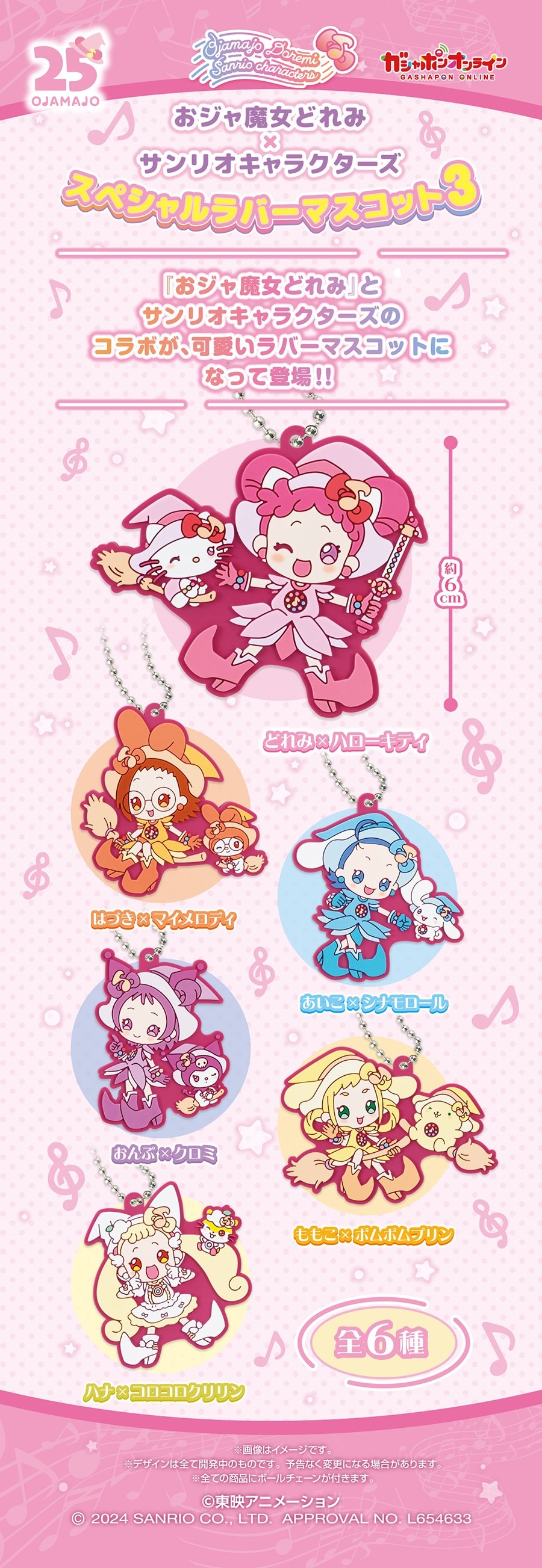 在 2020 年推出的橡膠吊飾收藏第一彈及第二彈後,時隔四年 DoReMi 與夥伴們再度攜手超人氣三麗鷗明星們一起登場!本次同樣將六位小魔女與六位三麗鷗明星配對製作成橡膠吊飾,可愛的頭身比例看起來較之前收斂一些,同樣收錄「DoReMi 與 Hello Kitty」、「羽月與美樂蒂」、「小愛與大耳狗」、「小音符與酷洛米」、「小桃子與大耳狗」以及「小花與可樂鈴」六種款式,將小魔女與三麗鷗明星的造型相互結合,在畫面上擺設出可愛的動態,喜歡小魔女 DoReMi 和三麗鷗明星的玩具人們不要錯過!