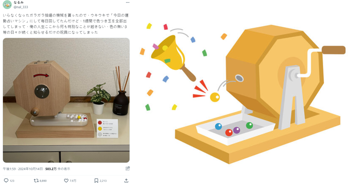 日本推主表示,拿到了一台不需要的抽選機,開心地把它改造成「今日運勢占卜機」,每天都轉一次,結果一週內就把有顏色的彩球全抽完了。這下好了,這機器變成了一個咒具,只能告訴自己,從今以後人生不會有什麼特別的事發生,剩下的就是無色的三等日子。