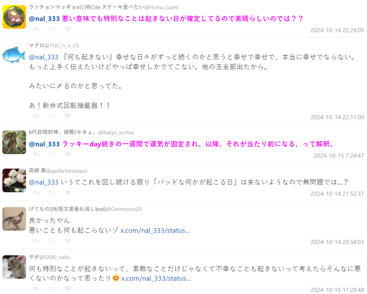 雖然推主這樣說,但網友反應其實挺樂觀的,認為「沒特別的事情發生」也許並不完全是壞事,甚至可能是一種穩定、無災無禍的美好日子。「不會有壞事發生」,暗示安穩的生活也是一種幸福,以輕鬆幽默的語氣來探討「日常無變化」的哲學意涵。
