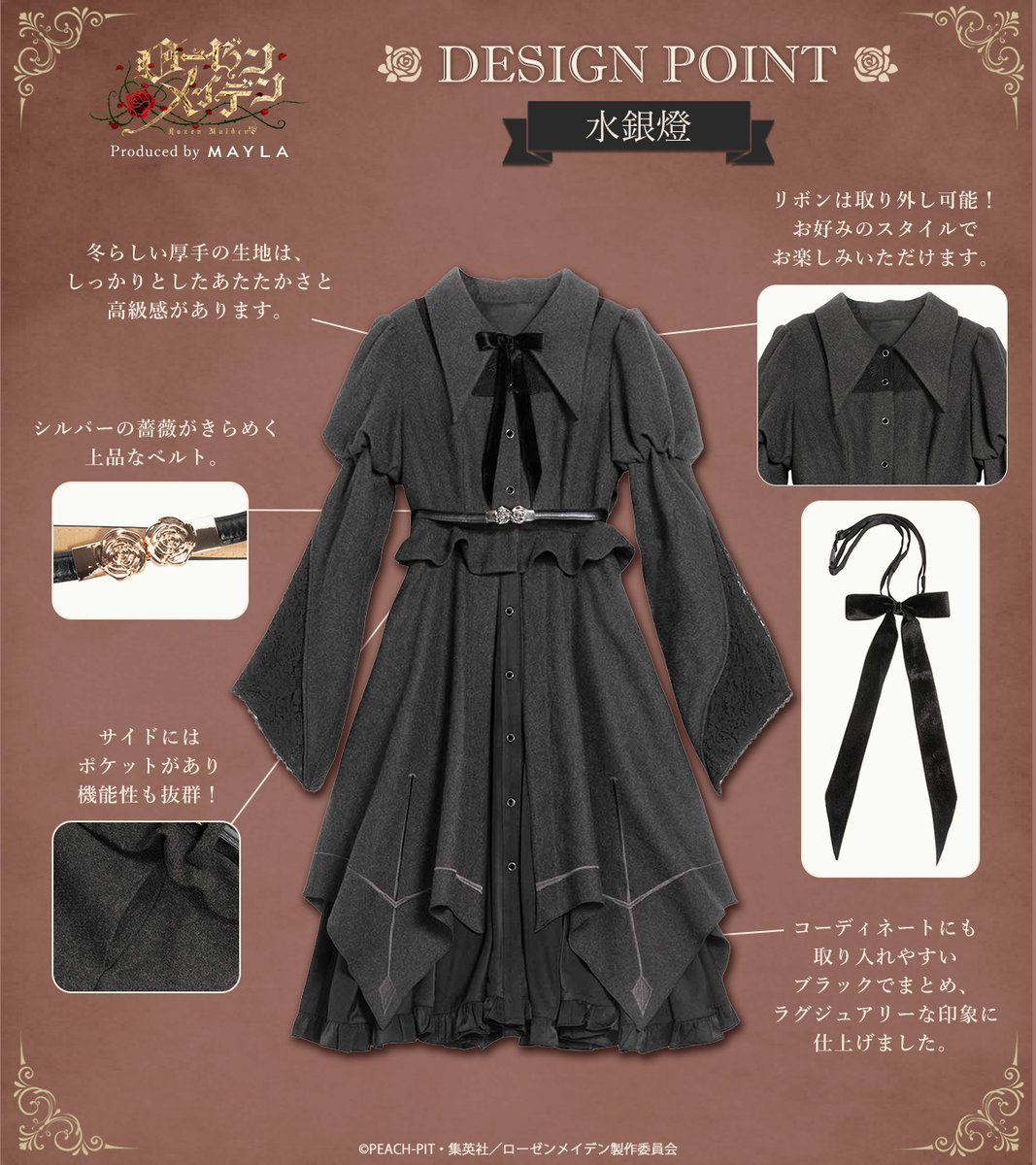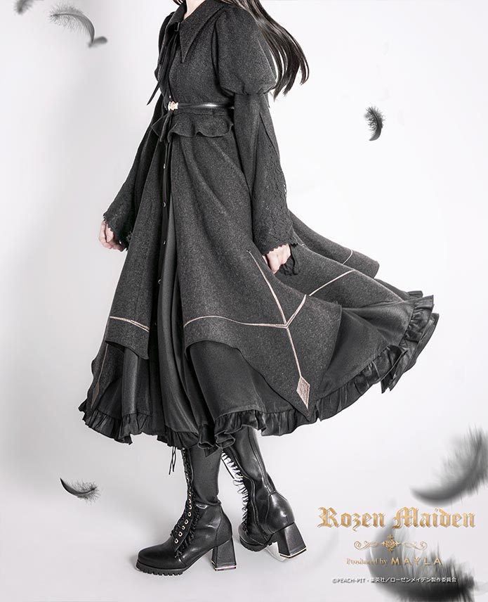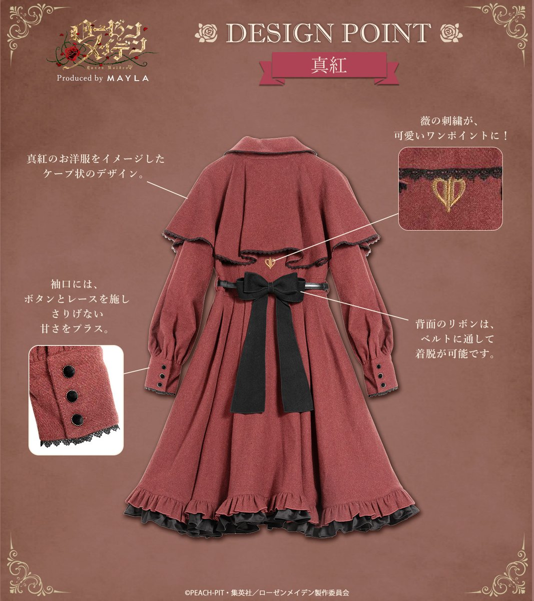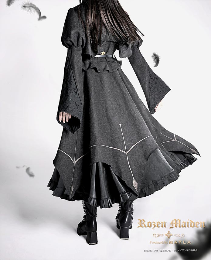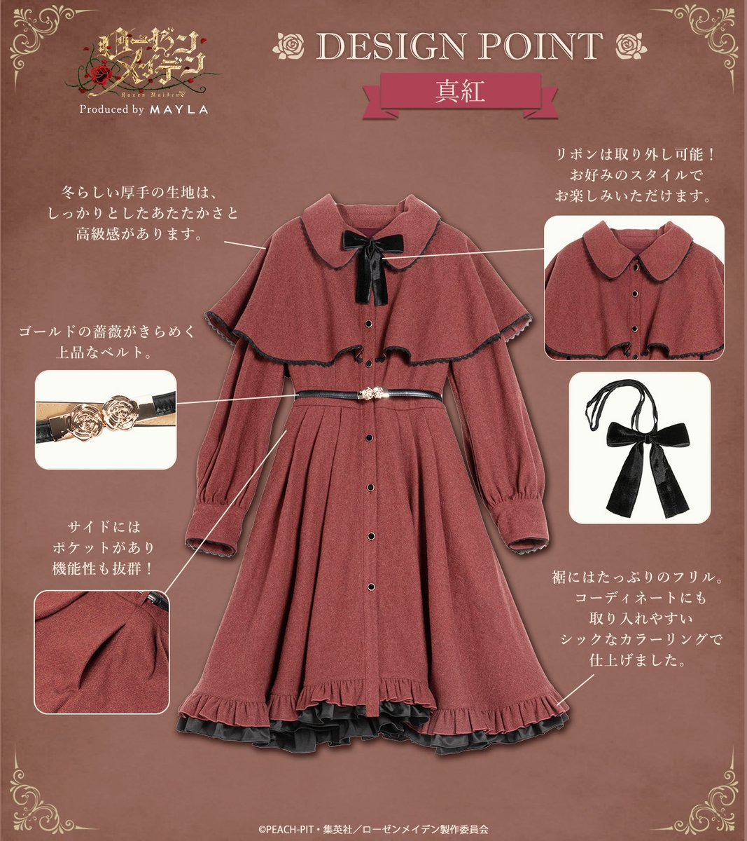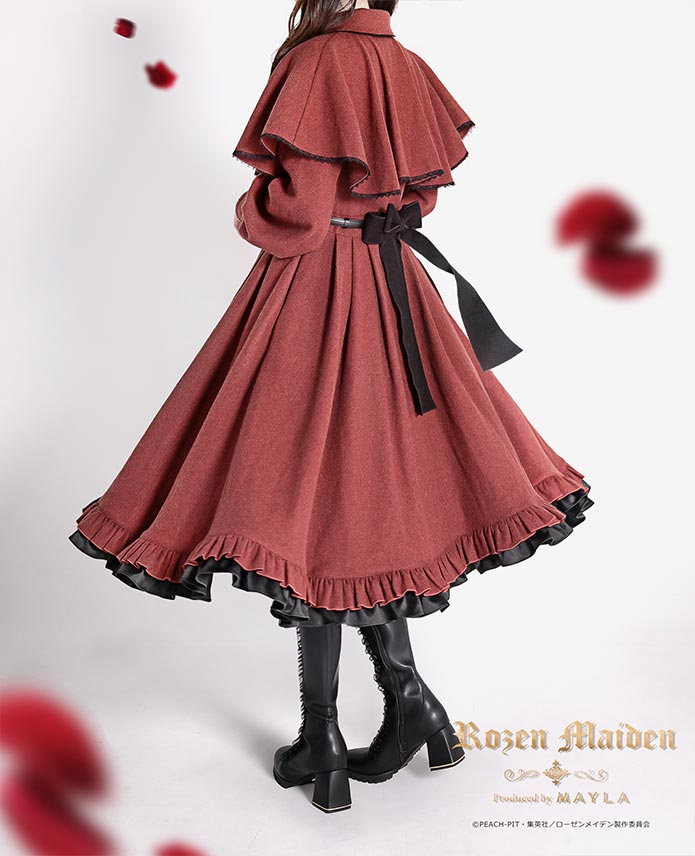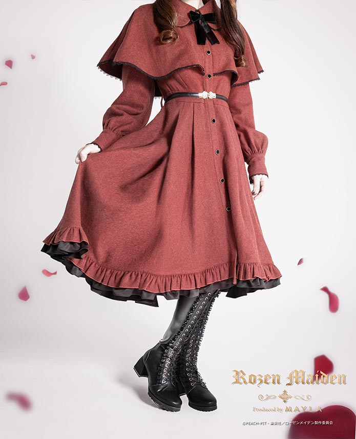 這次以劇中最具人氣的兩位角色 - 真紅 & 水銀燈的服裝為靈感,結合原作設計搭配 MAYLA 擅長的服飾製作,將其變化成成套的連身洋裝,選用帶有暖意的毛料布面製成,非常適合作為秋冬直接當作成套的穿著,只要再搭配一件外套就可以輕鬆出門,展現十足貴氣的視覺效果。