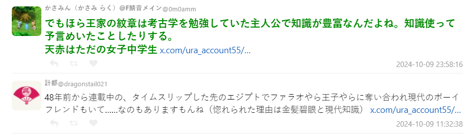 亦有網友指出,其實 1976 年開始連載到現在,細川智榮子與芙〜みん的作品《王家的紋章》,也是一個穿越到古埃及的奇妙故事,更因為女主角本身有著強大的考古學知識,熟知古代歷史的她被 3000 年前的古埃及人們奉為「尼羅河女兒」,也是個經典案例。