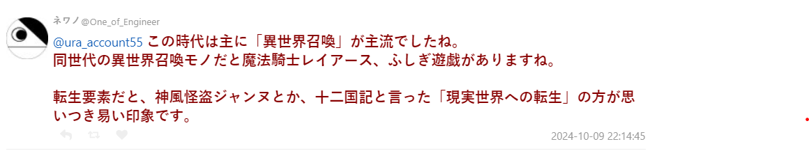 不過也有人認為,這並非轉生故事,比較像是「時空穿越」或是「異世界召喚」,像是《夢幻遊戲》跟《魔法騎士雷阿斯》都貼近這個設定。