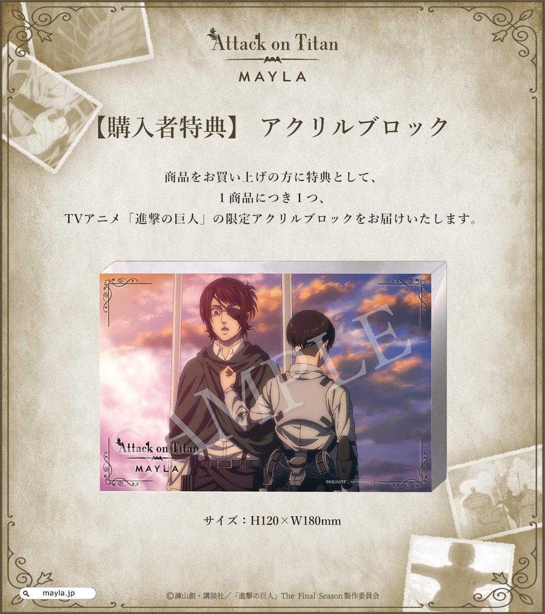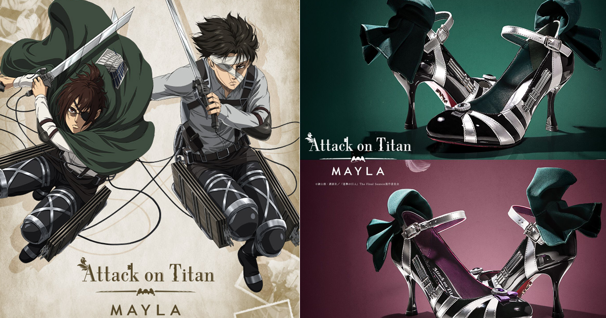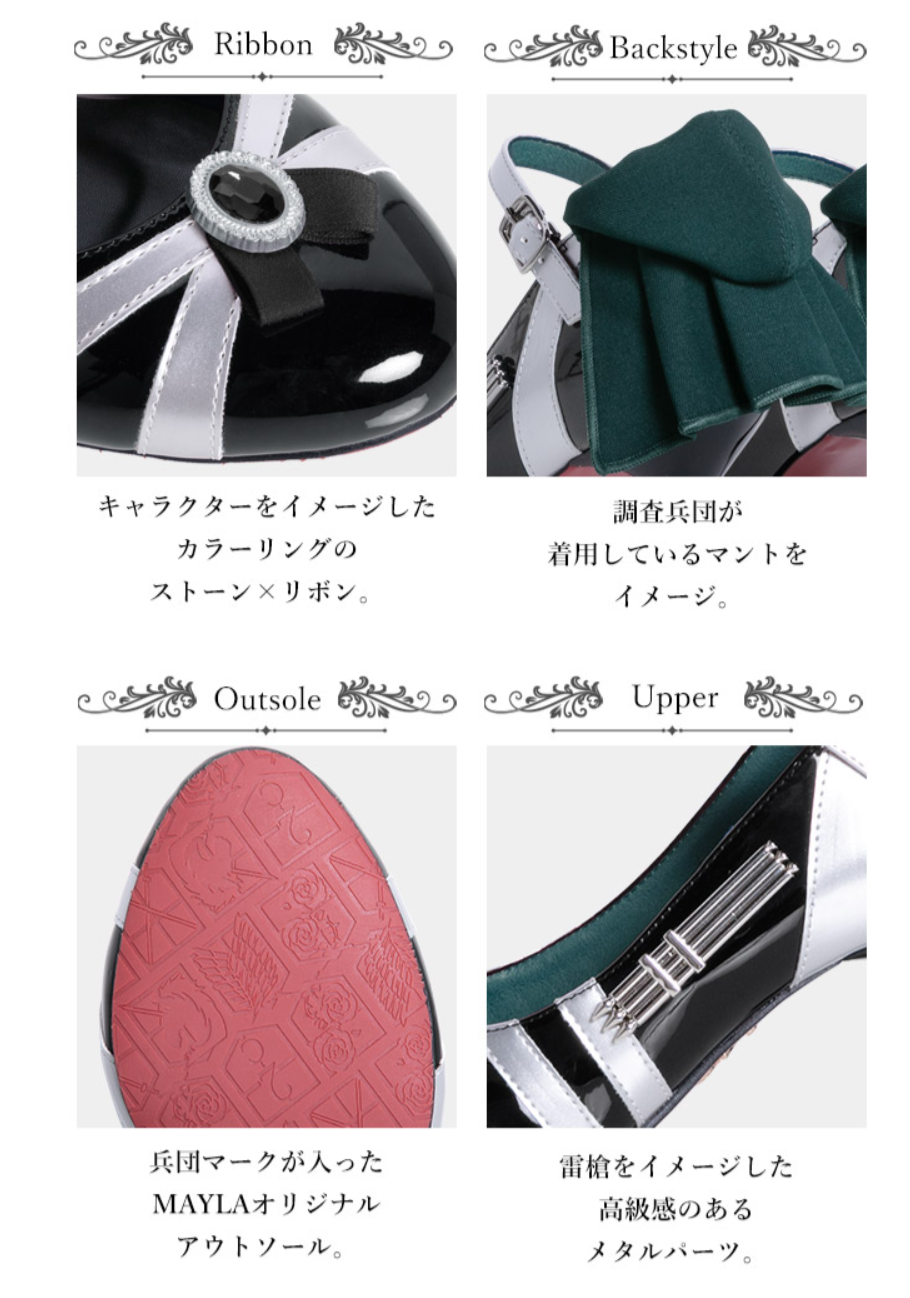 近日宣布將再次與《進擊的巨人》合作,繼先前以最終章艾連最終型態「終尾的巨人」為概念設計的高跟鞋款,這次再推出以調查兵團的兩位要員 - 兵長里維 & 漢吉為設計的高跟鞋。售價為 29,700 日圓,目前已可於 MAYLA 官網預購。