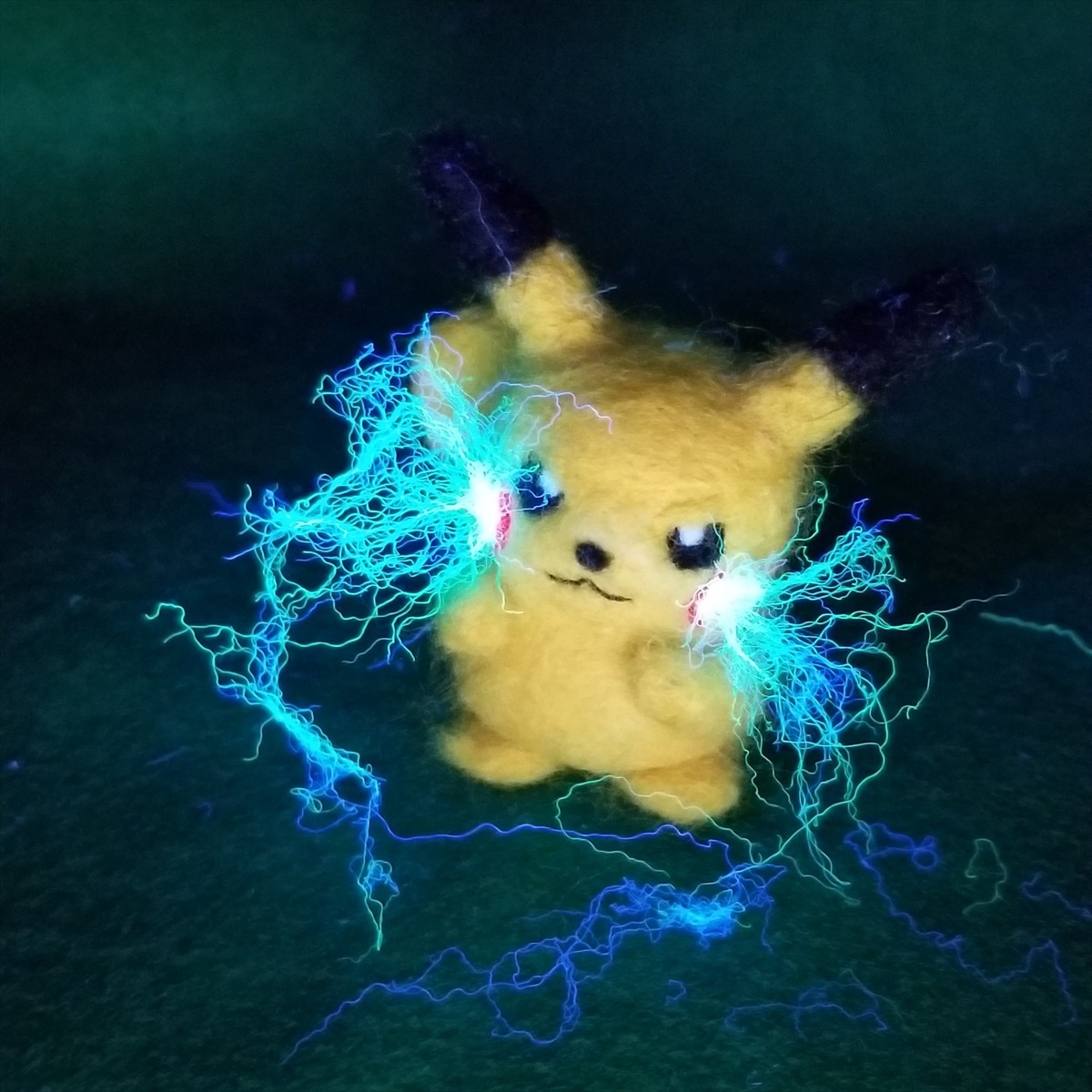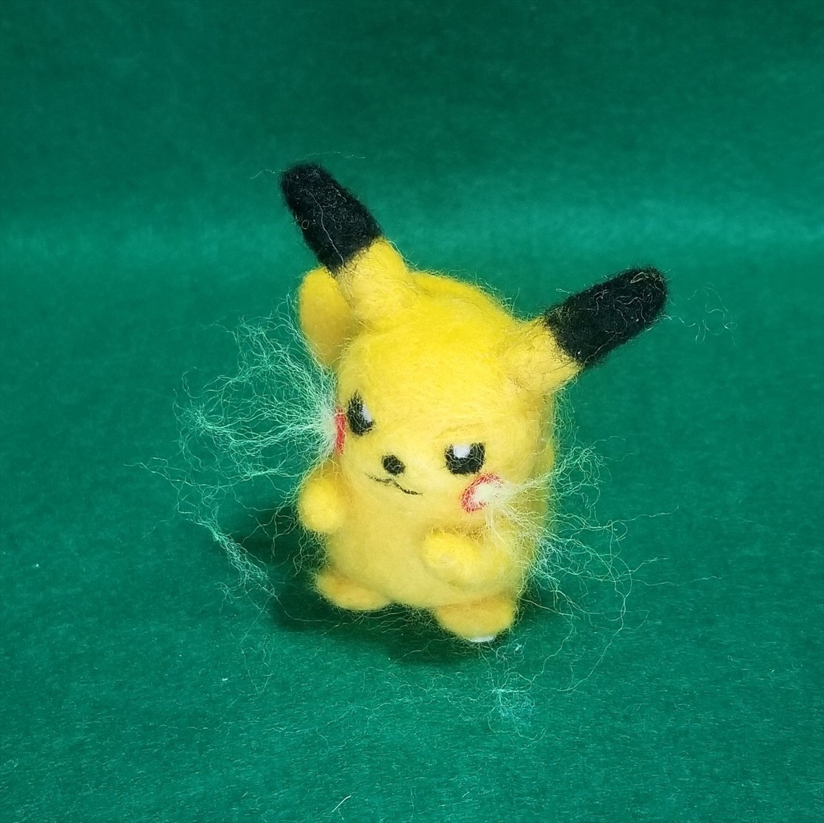 推主にょほ(@nyofoolest)用羊毛氈做出了一隻可愛的皮卡丘,不過看表情應該是要放出招式,臉頰上放出的東西在明亮環境中看不出來是什麼,不過要知道皮卡丘臉頰上的紅色部分是電力袋,所以一定是放電,但要怎麼做才能讓羊毛產生「電」的效果呢?