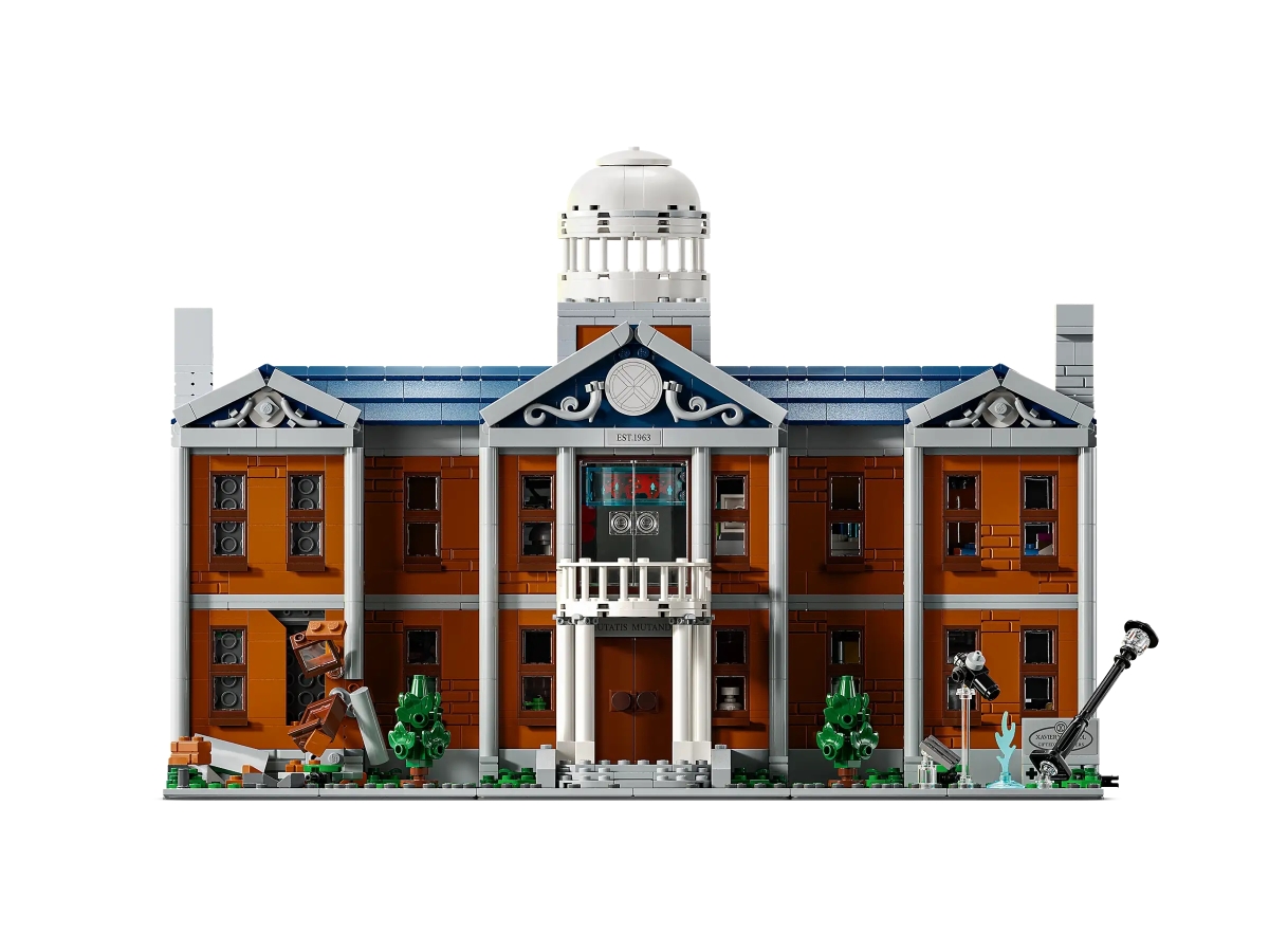 這棟採用 3093 片零件建構而成的兩層樓建築 X學院組完之後高約 27 公分、長度則有 40 公分,外牆主要以橘色、灰色零件為主調,位於學院前的綠色草地右方還設置了一塊標示出「Xavier's School for Gifted Youngsters」石碑,並在做左側房屋的窗戶製作出能輕易拉開的機構,後方則可以看到籃球框、能夠拉開危險室(Danger Room)黃色電箱裝置,加上位於二樓的氣派陽台、建築上方的圓頂,整體可說是充分傳達了 X學院的氣派外觀與細節。