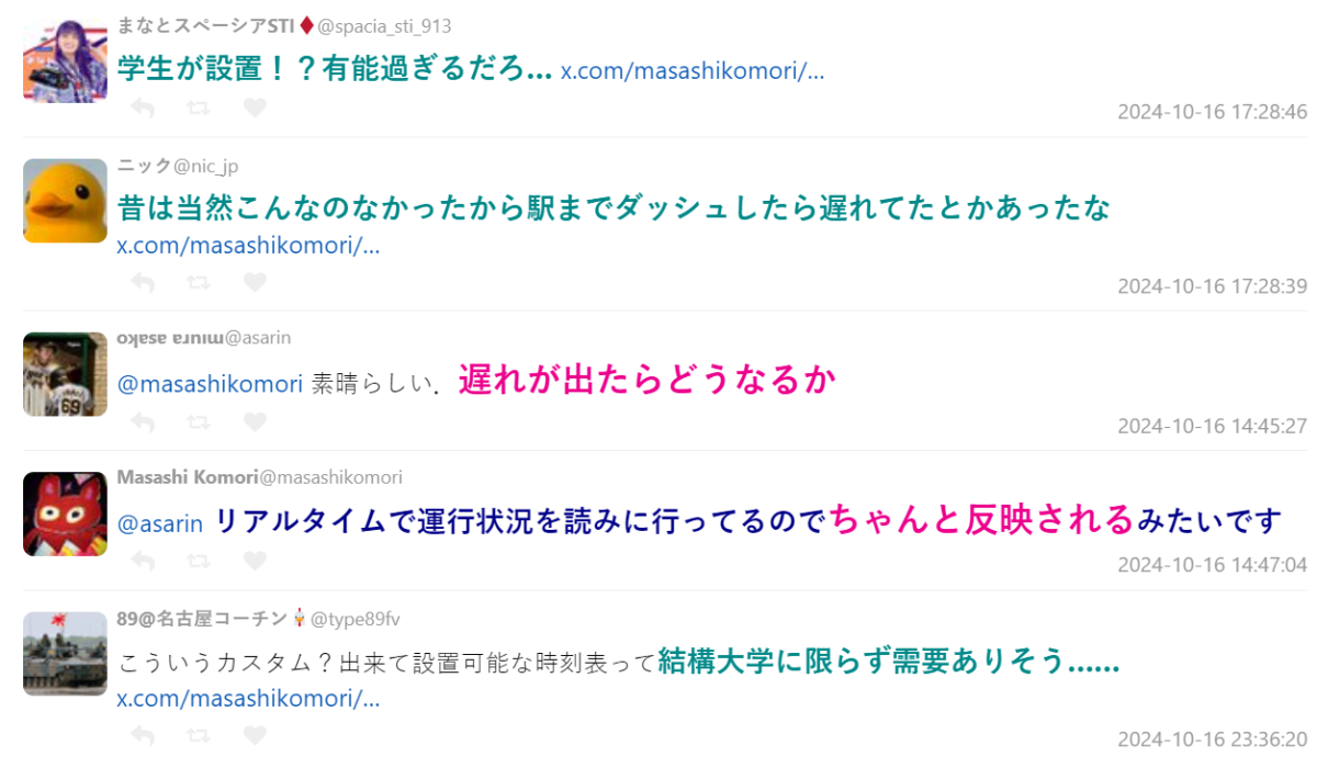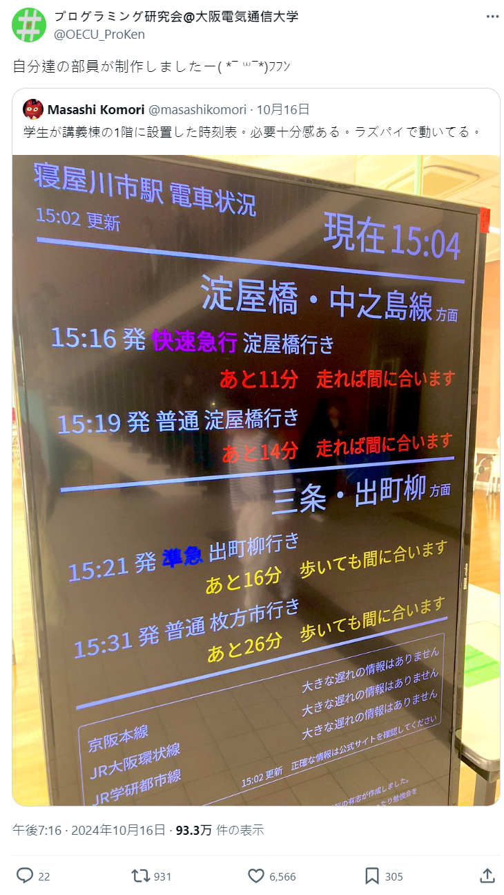 在 X 上引起話題後,大阪電氣通信大學的程式開發研究會官方 X 發文表示,這是部內成員製作的,當時也是為了希望讓學校的學生搭車更便利,運用自己所學,使用 Tauri 開源軟體框架製作,將車站的資訊可以即時顯現在螢幕。