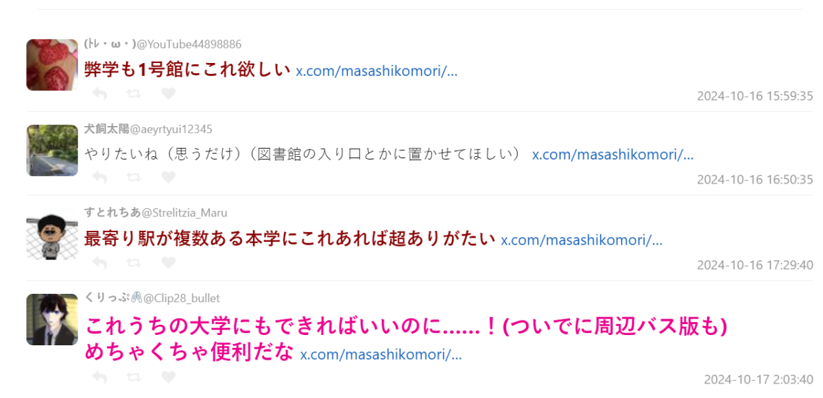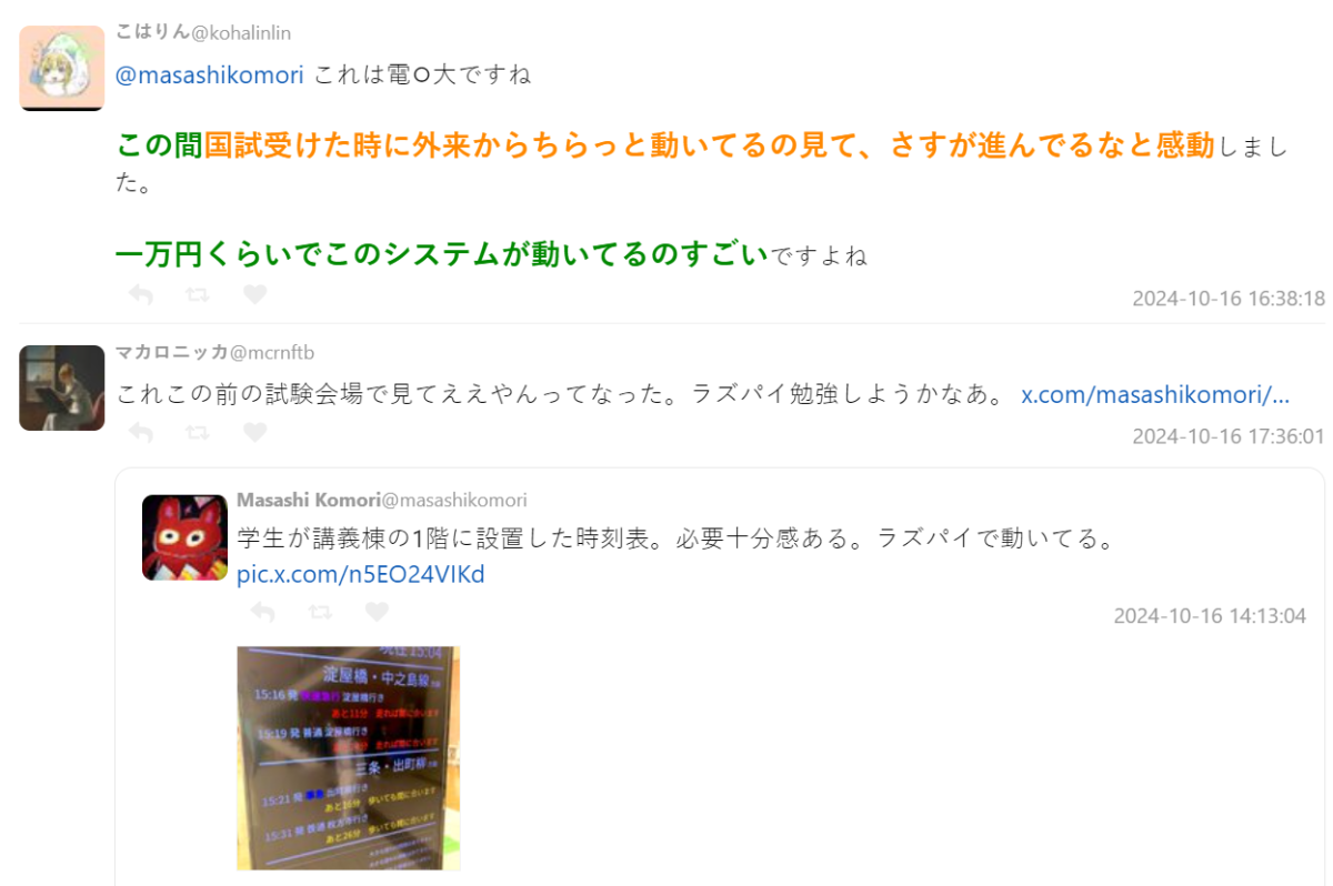 亦有網友表示,先前到這邊參加考試,意外的發現校園內的「鄰近車站即時時刻表」真的非常方便,雖說不是多驚豔的東西,但真的符合理科生的思維「在有限的時間與預算內,做出最好的東西」,這東西甚至只要花 10,000 日圓就可以運作。